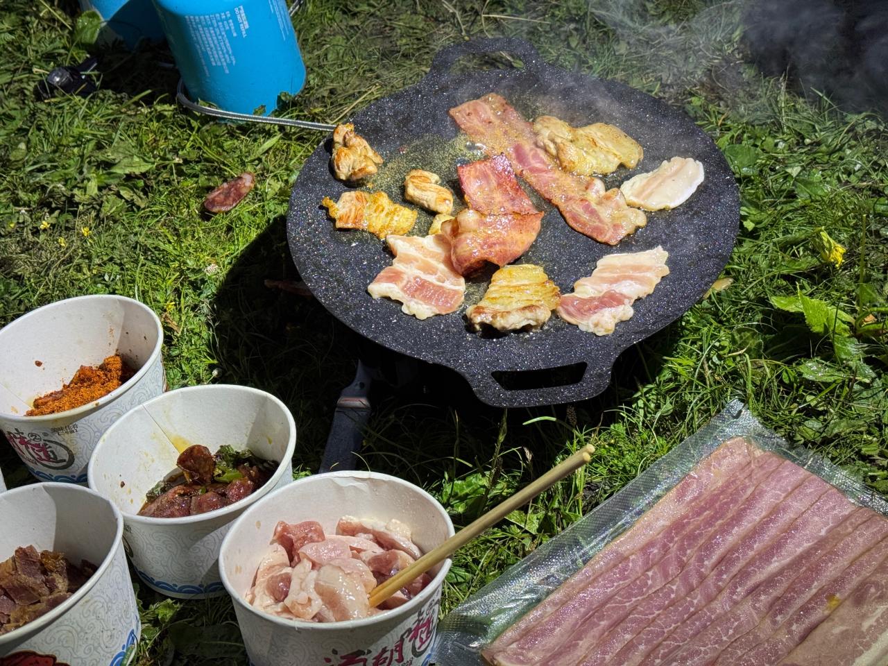 走累了心情是淡淡的感覺腰痠背痛,大概十點從起點開始走四點過到了營地紮營,晚上喫烤肉鍋巴土豆炸雞青椒炒香腸喝粥和雞湯,香迷糊了太好喫了