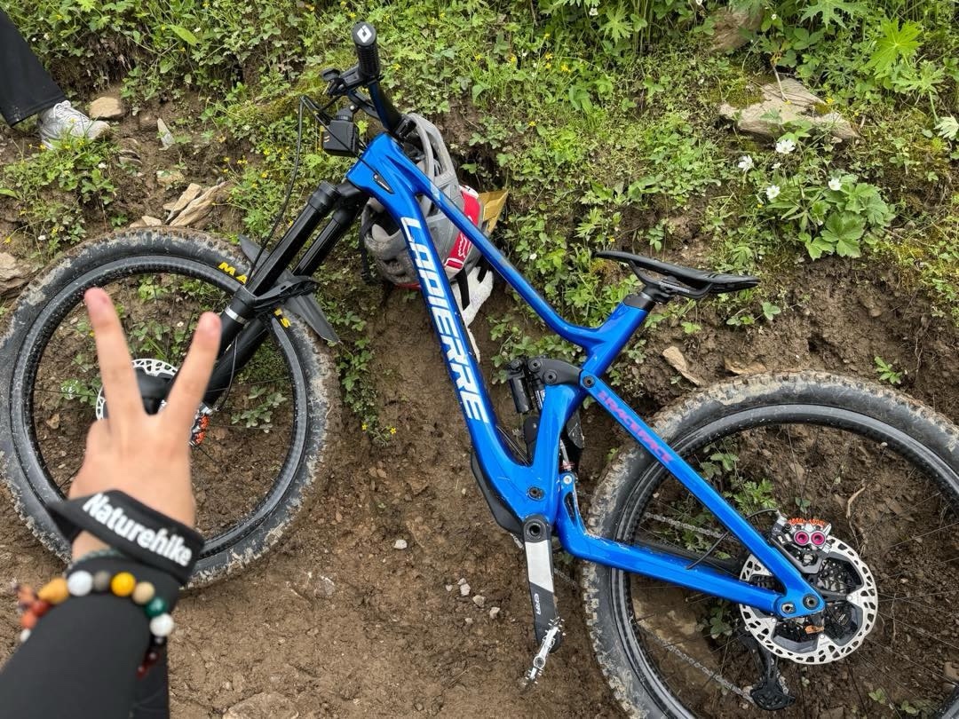 一路上遇到很多次一個推着山地車上坡的大神,他說他要推上去然後騎下來,太厲害了…跟他聊天,因爲沒信號所以拍了大神二維碼(沒錯我們在山上就這麼拍二維碼備忘錄記電話號碼),問他能不能和他車拍照他同意了就拍了幾張哈哈哈哈第二天下山還遇到他了!
