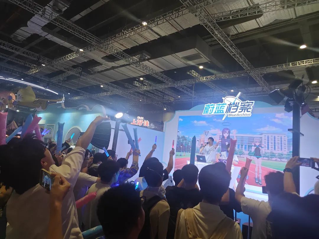 當然,資歷僅僅只是體現老二次元純度的一部分。對二次元傳統藝能的傳承與共鳴,也成爲各家二遊展臺點燃玩家熱情的關鍵。《蔚藍檔案》每屆必備的打碟蹦迪環節就堪稱經典,一位DJ配一名Coser足以點燃全場,臺下玩家揮舞應援棒,隨節奏激情打call和跟唱,激活獨屬於BA音樂的DNA。