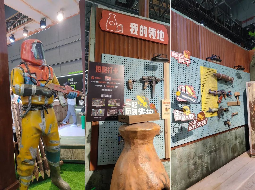 最顯眼包的無疑是一副廢土風格的SOC遊戲《失控進化》。展臺圍繞經典的擼樹、打獵、合成等玩法設計出一套別有趣味的互動挑戰。期間我還看到一位玩家拿起石頭和樹樁較勁,但沒砸幾下,這位老哥就氣喘吁吁敗下陣來,笑罵了一聲:“原來這樹樁這麼難拆的嗎。”