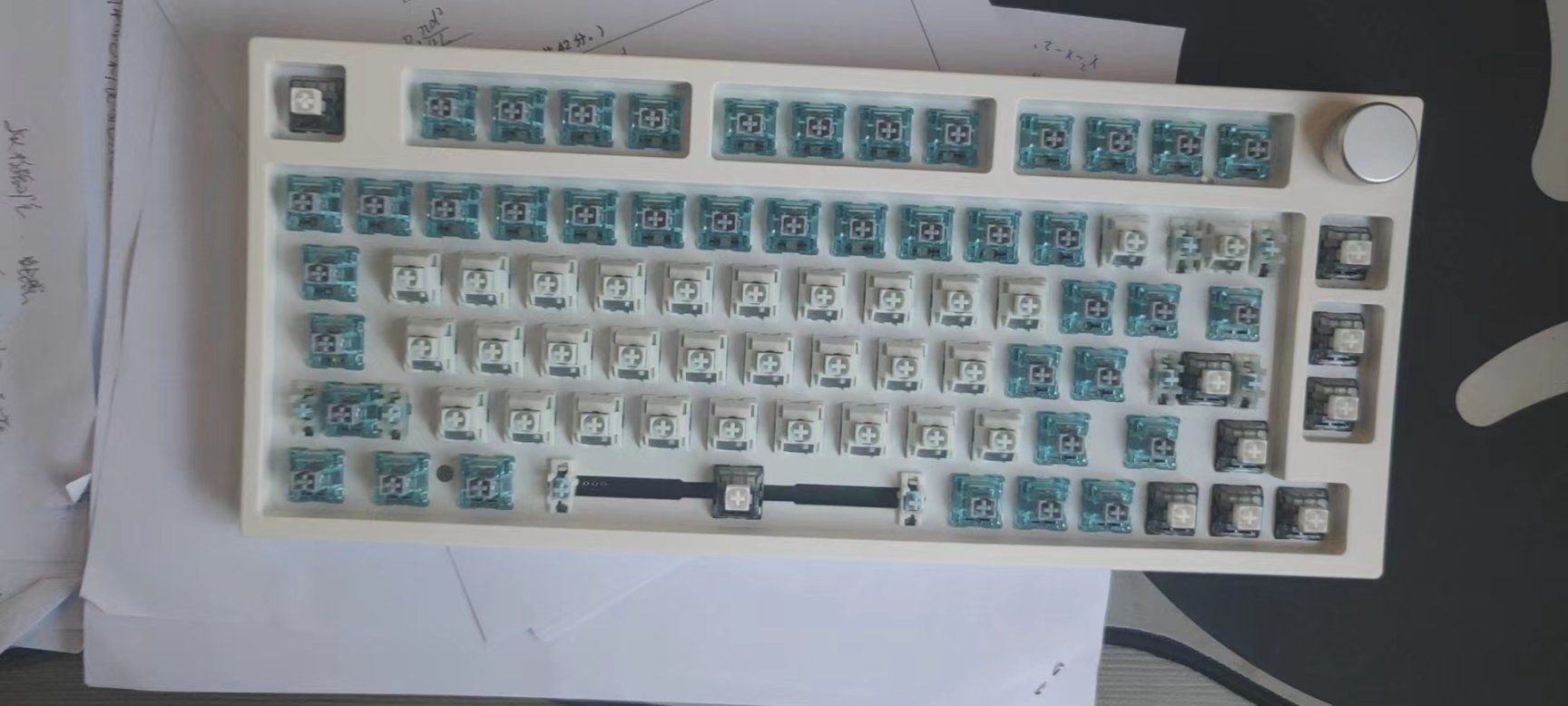 这里说下,兄弟们插轴时候一定!一定!!!要检查轴体底座的金属脚是不是直的,弯了一定要给掰直(直接用手掰就行)不然弯脚上了套件会伤到套件里的孔、并且是接入不了套件里面的电路板的,也就是按了没反应白接。组装完整把键盘之后一定用软件来看下整套键盘的所有按键是否都正常接入并且反应灵敏。没反应的按键大概率就是轴出问题了,真要是这种情况的话可以取出来轴用钳子掰直金属脚,如果插上还没反应的话那这个轴就是臭了,扔一边当挂件吧。这里不得不吐槽一下凯华的品控,第一次买的Box白里面就有一个金属脚弯了我没检查导致最后臭轴,第二次买的凯华轴体里面的夜阑线性发来就是个臭轴,两个脚一长一短插上没反应。