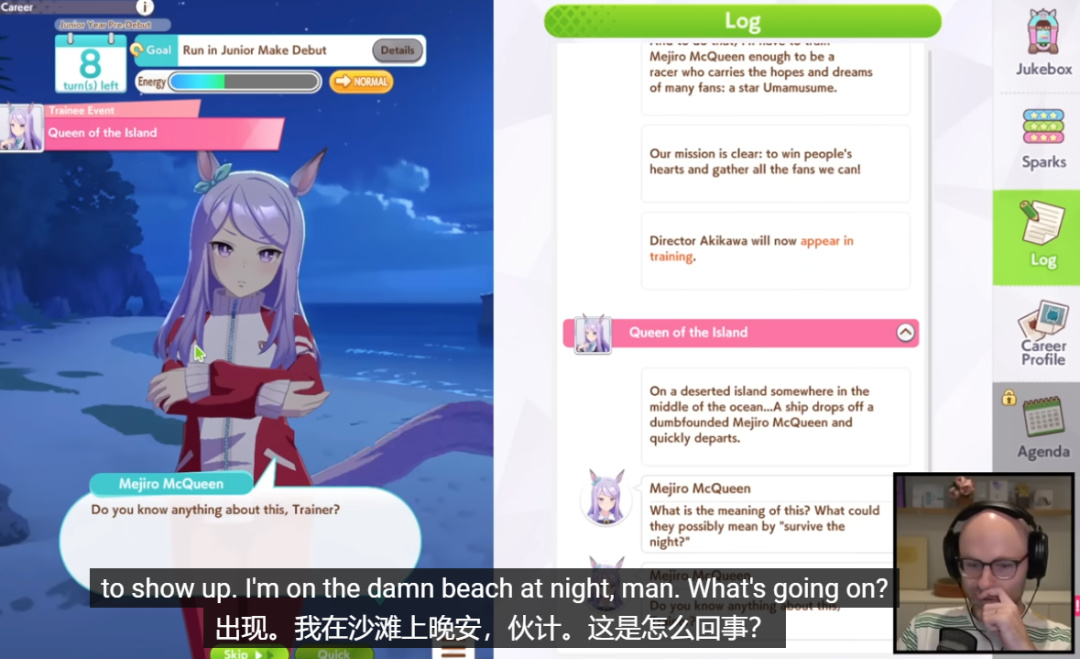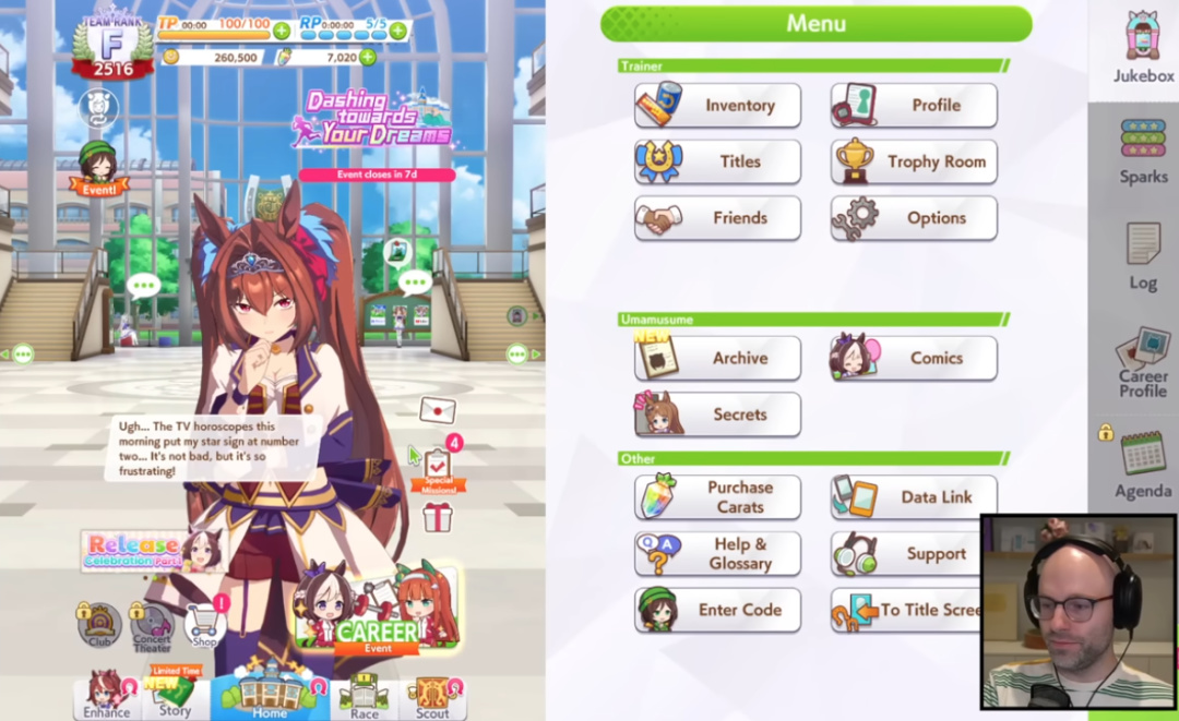 很明顯,他對這類遊戲一點也不瞭解。剛進入主菜單就被密密麻麻的按鈕弄暈,過新手教程時甚至搞不清自己到底是參賽的馬、擬人化的馬娘還是負責訓練她們的教練。