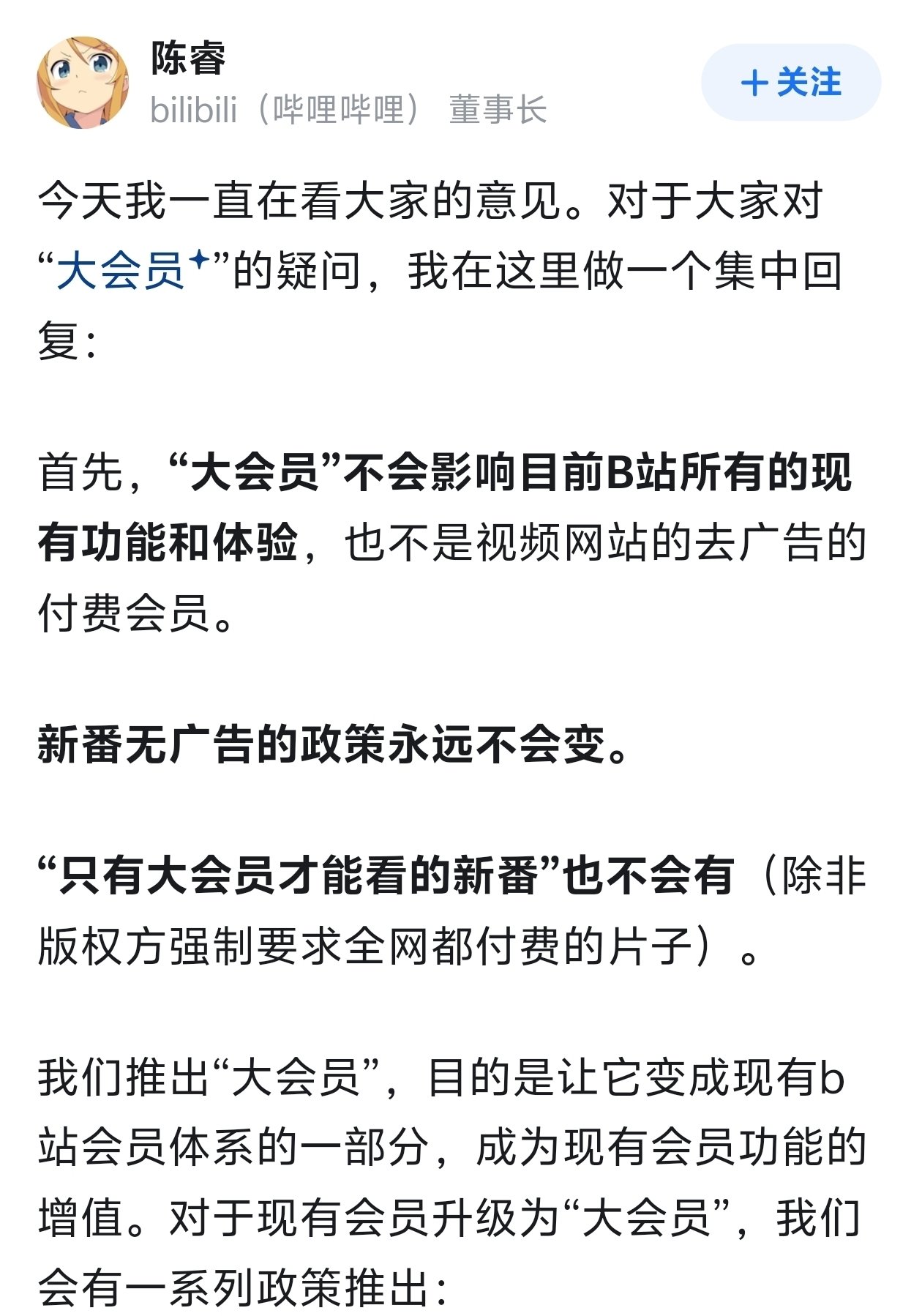 2016年10月,B站开通大会员活动。10月10日,陈睿于知乎回应称“大会员”不会影响目前B站所有的现有功能和体验。但目前B站绝大多数番剧、电影、纪录片均需要大会员才能观看,同时常规视频1080P以上的画质也需要大会员才能开启。