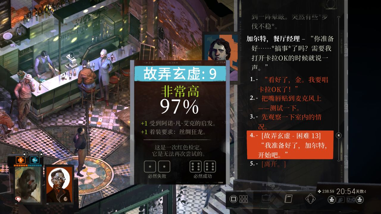 *黃昏以後卡拉OK可以唱了,現在是觀衆最全的時候,對話加爾特交付小教堂磁帶,上臺後不點任何選項,過故弄玄虛檢定成功,唱完卡拉OK把神祕學家的對話任務做完,之後蓋裏會離開。