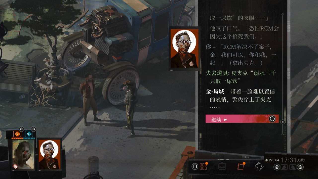回到金的RCM車前,使用無線電聯繫圖書館調查圖書證信息確認身份,備份存檔B,與車旁兩個夾克男青年對話,過疑神疑鬼檢定成功,拿到兩件夾克。