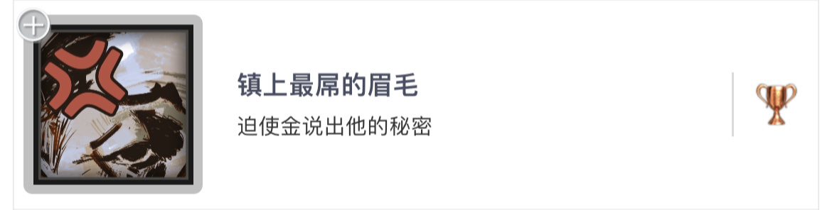 金在你身邊的任意時刻爭強好勝≥8與金對話選擇我想聊聊你,要求金說出他過去的祕密,跳杯「鎮上最屌的眉毛