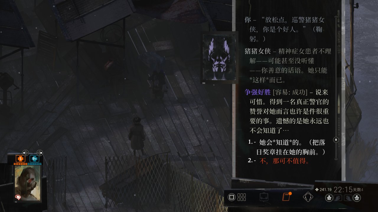 晚上22點後,傳送去漁村小屋,此時備份存檔C,先回房間與金分開,獨自前往木板道見義警豬豬女俠,爭搶好勝≥4過被動檢定成功,對話選擇你是個好人(鞠躬)她會知道的(把落日獎章掛在她胸前)跳杯「獎章分法機