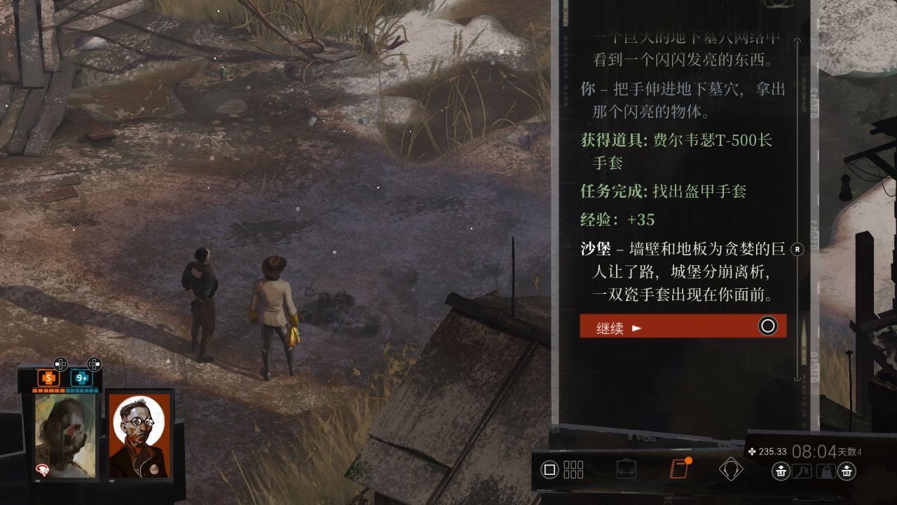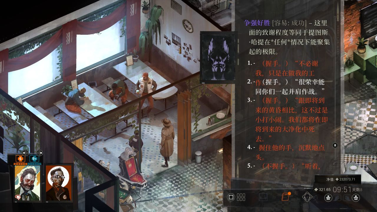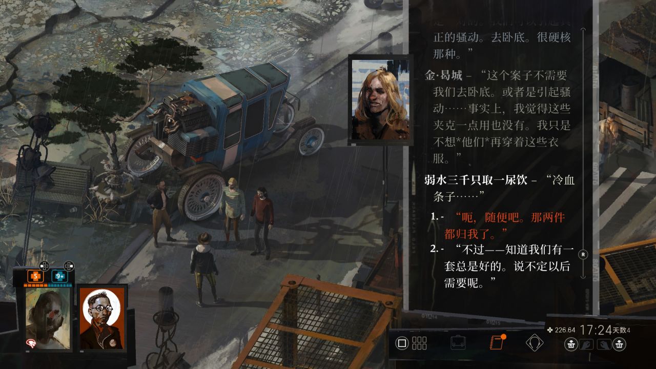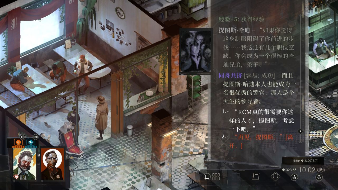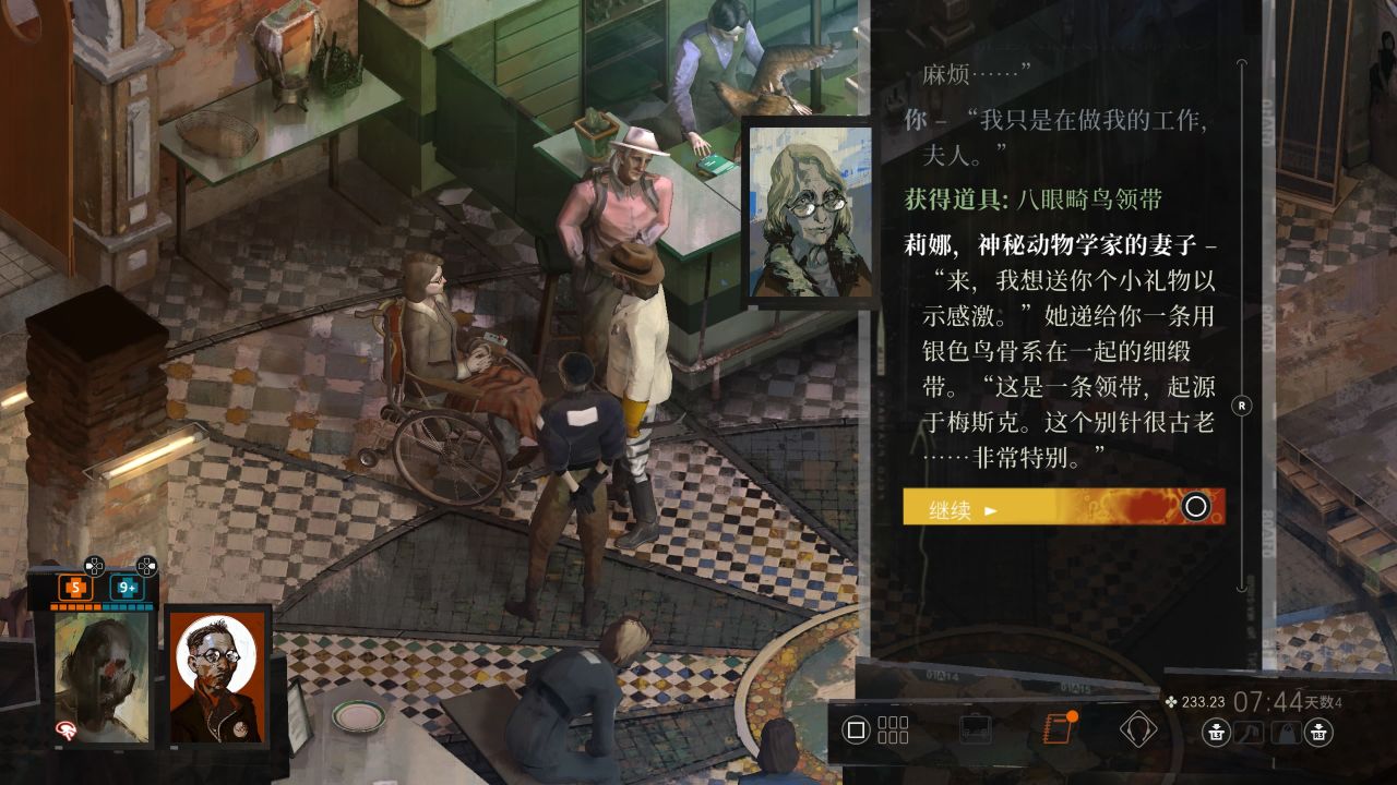 醒來後和金對話調查完下樓對話提圖斯,選擇很榮幸能同你們一起並肩作戰他們是爲了自己的信念戰死的(榮譽+1)達到11點跳杯「大陸榮譽警察