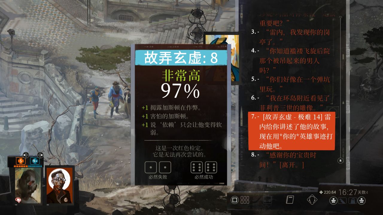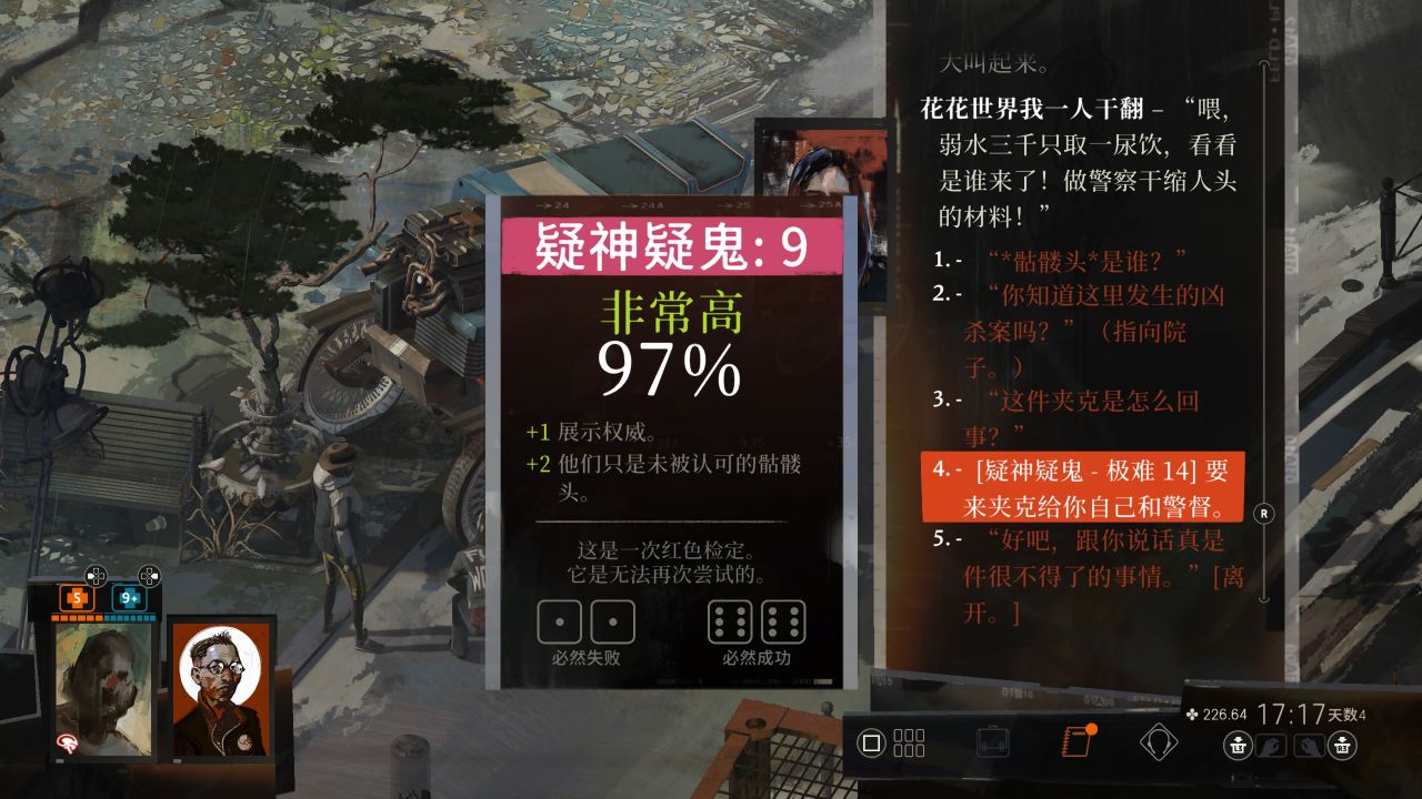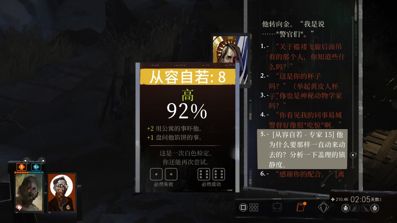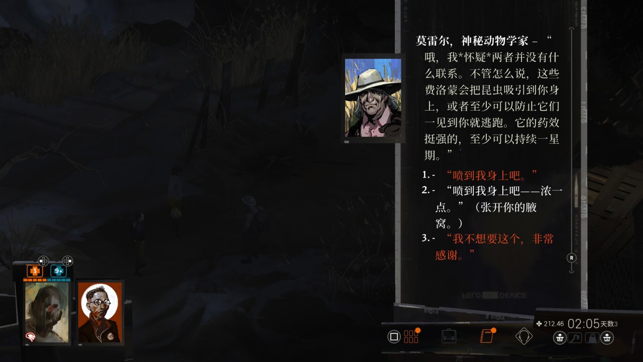 *第四天本流程加點這裏會觸發黃色思維球,發現羅斯馬雷玩投擲球有作弊行爲,順序建議是先過羅斯馬雷檢定成功要到巨大三明治,之後揭穿他的作弊行爲,再配合裝備過雷內的檢定有相應加成。