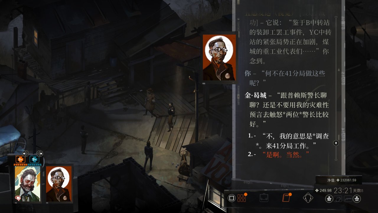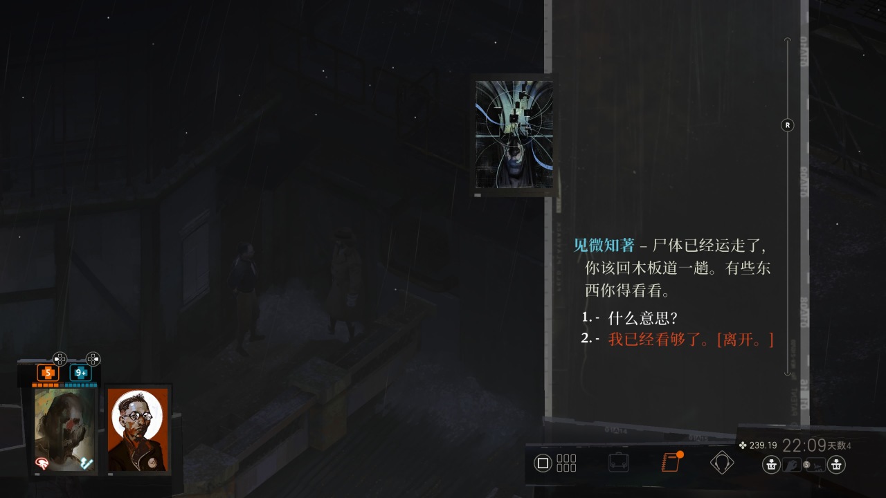 調查完屍體後,不要將屍體運走(重要)對話金完成警察對決一系列對話,回旅店開個房間,回房和金分開,去浴缸洗個澡,打開物品欄互動之前從工會會長處拿到的白色信封並僞造簽名,出來敲隔壁金的房門跳杯「下班後打擾金