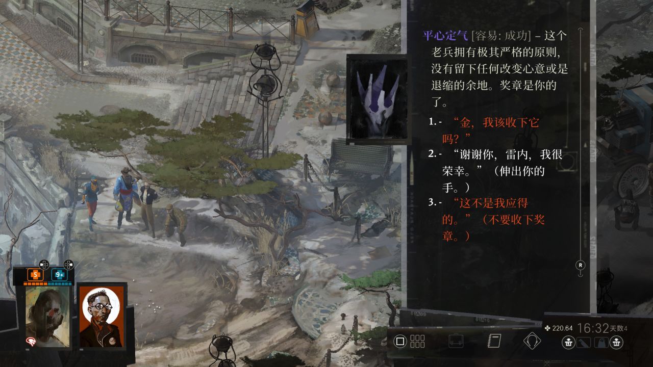 回去找雷內,過從容自若故弄玄虛檢定成功並接受獲得落日獎章