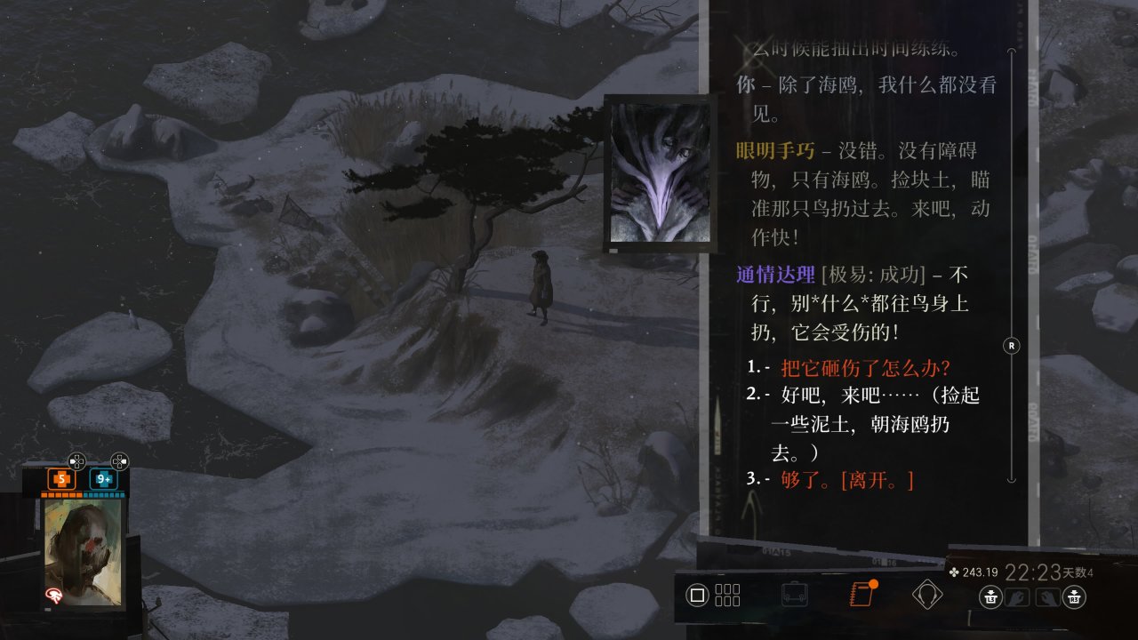 繼續獨自經過教堂往左上到達下圖地之角位置(要求眼明手巧≥9)觸發黃色思維球,朝海鷗扔三次泥土,觸發劇情跳杯「引發鳥的風暴