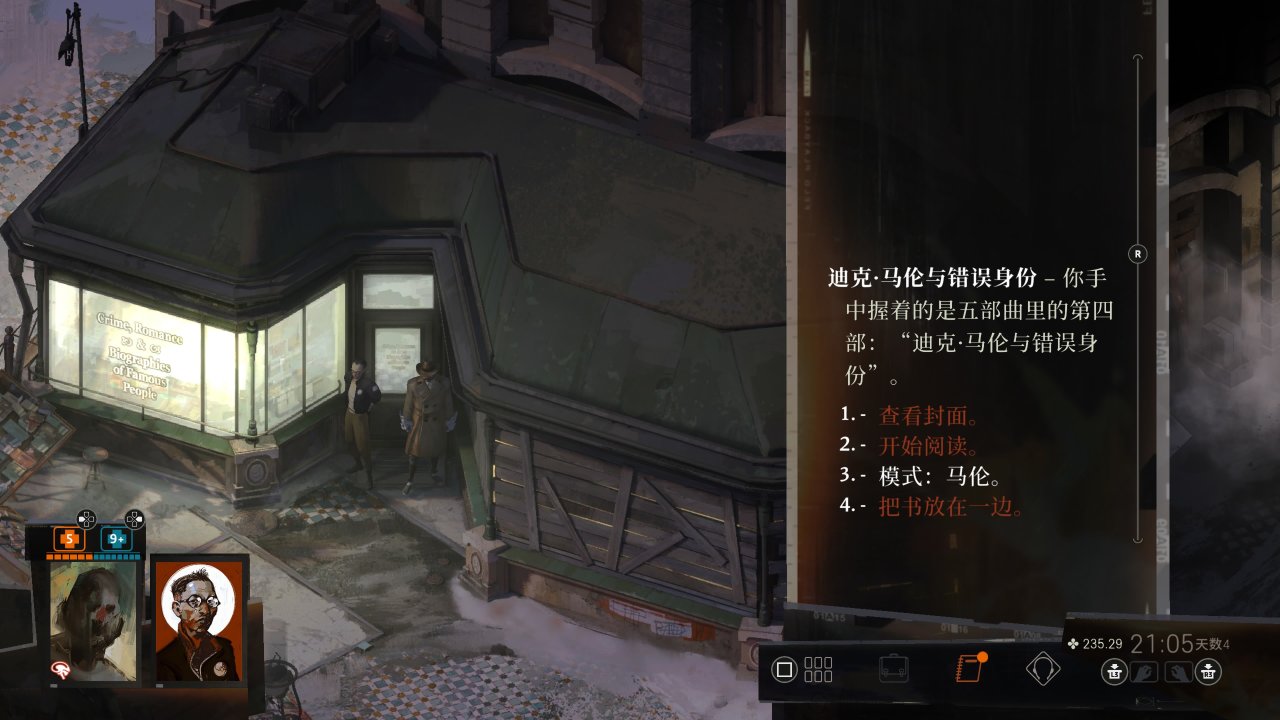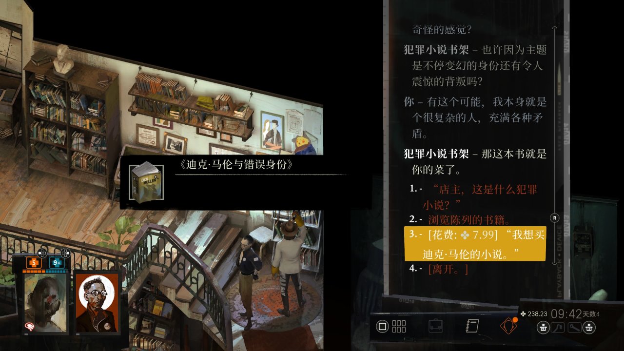 電梯上2樓完成相關調查,取得彈球創客大衣並裝備,同時裝備之前從安妮特處拿到的迪克馬倫帽子,去書店調查2樓拐角處的書架反應速度檢定成功,買下迪克馬倫與錯誤身份小說。