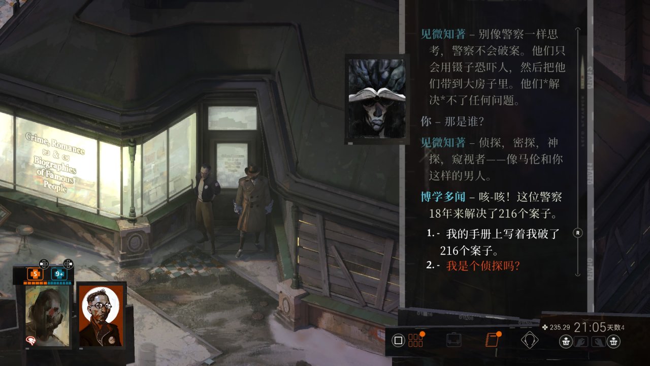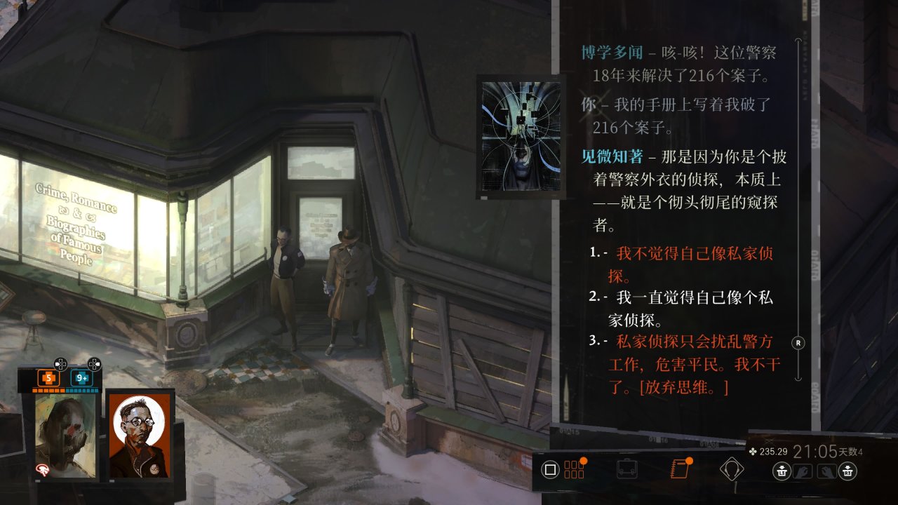 讀完小說後,分別詢問安妮特書店老闆娘故事結局未果,走出書店後,觸發兩次藍色思維球(要求見聞知著≥8)對話選擇我破了216個案子我一直覺得自己像個私家偵探。