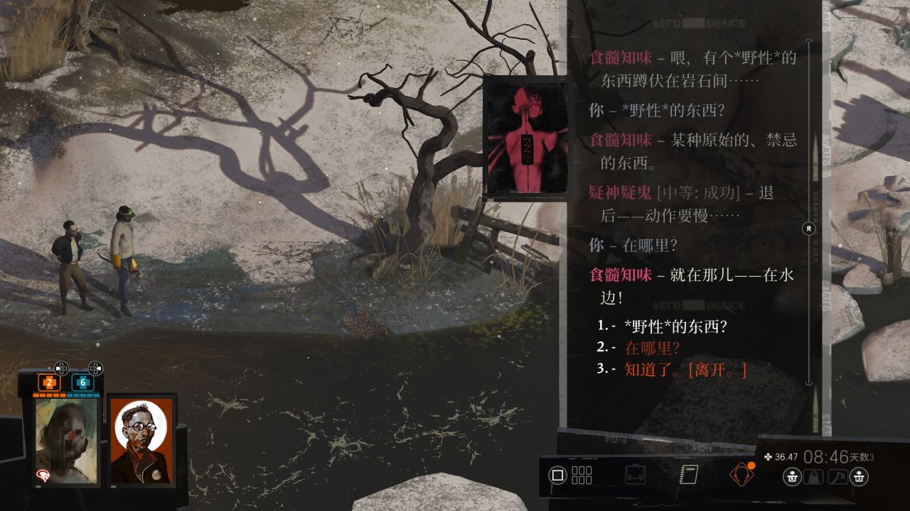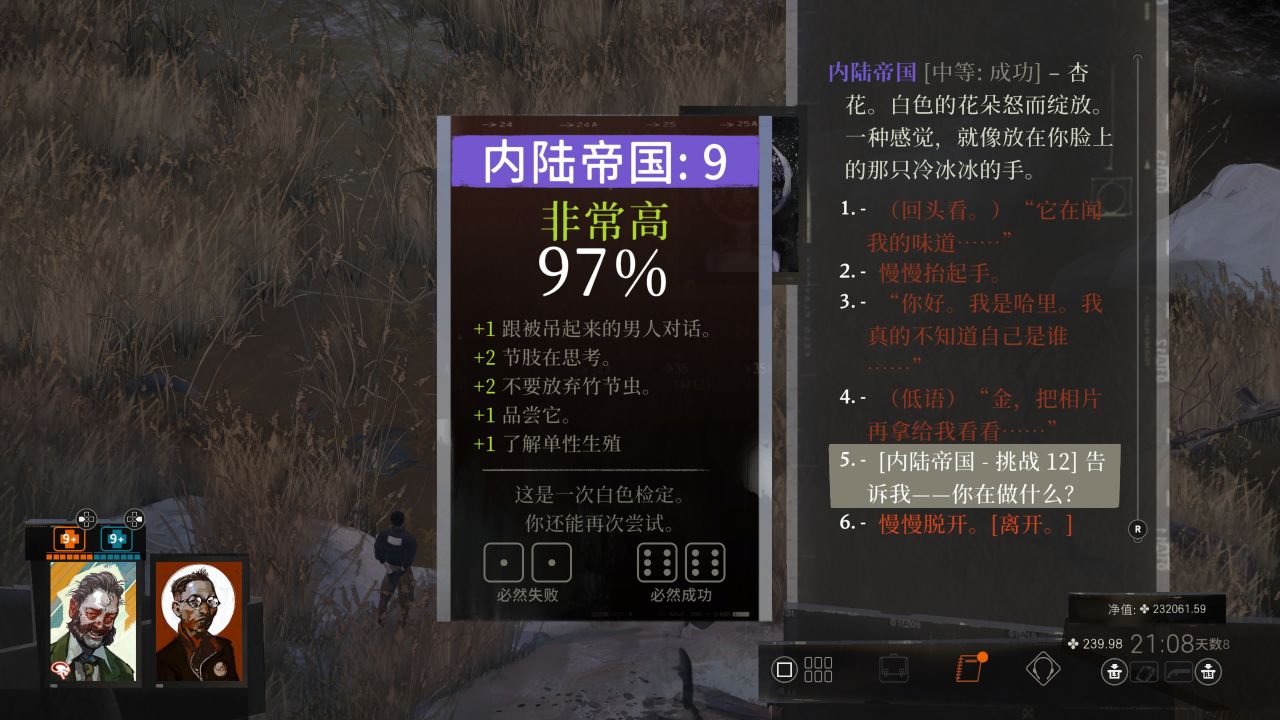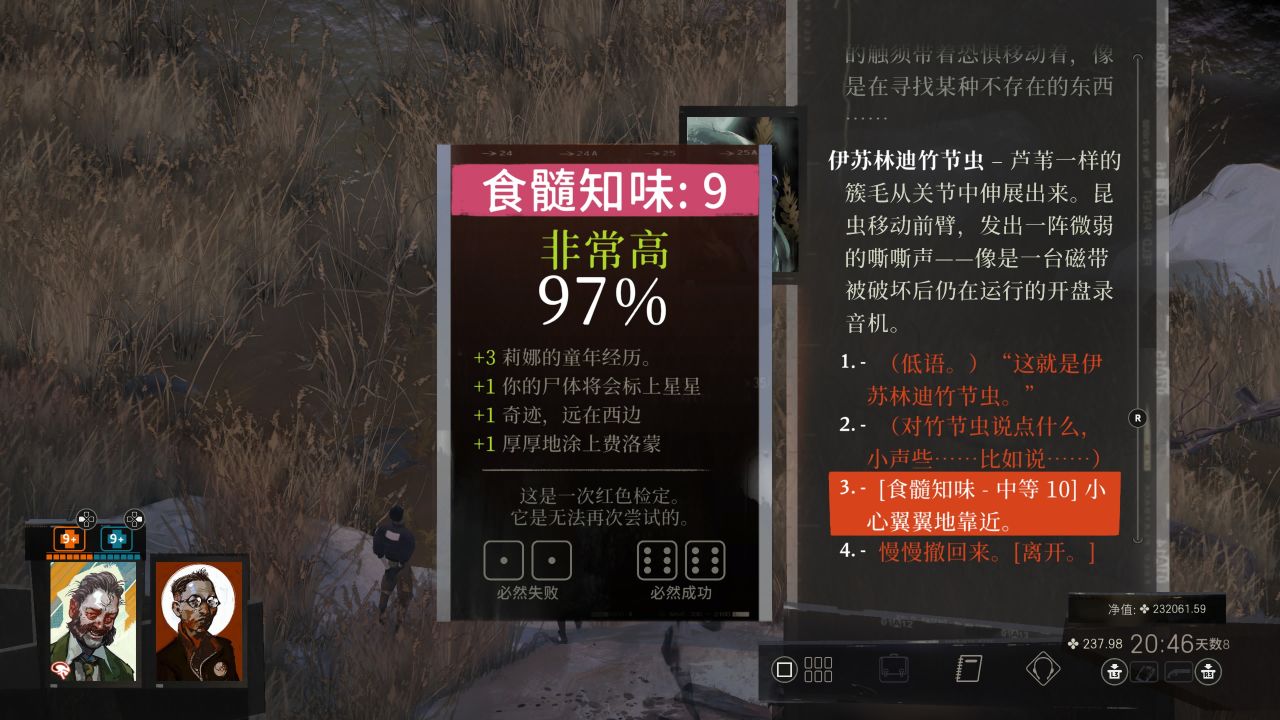 醒來繼續任務,最後過五感發達檢定成功失敗均可觸發竹節蟲,接觸後過食髓知味內陸帝國檢定成功,與竹節蟲完成最後的交流。