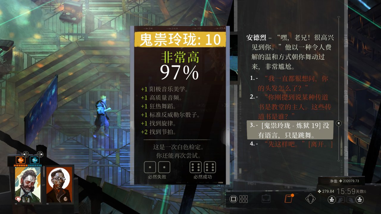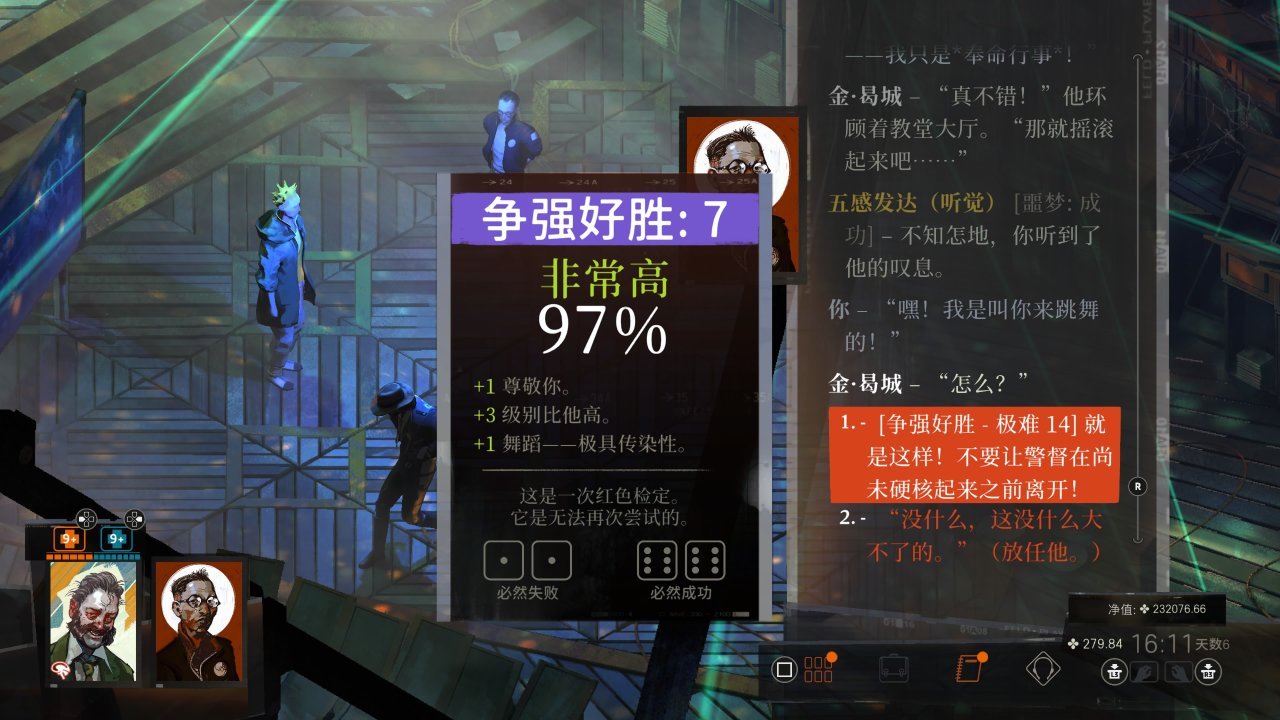 後面正常推進劇情,上一條路線如果逮捕了某人這次可以選擇放過,鬼祟玲瓏點滿後完成教堂相關檢定配合裝備可以去教堂把舞跳了。