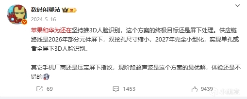 去年5月該博主就爆料了供應鏈路線是2026年部分元件屏下,雙挖孔尺寸縮小,2027年完全小型化,實現單孔或者全屏下3D人臉識別。