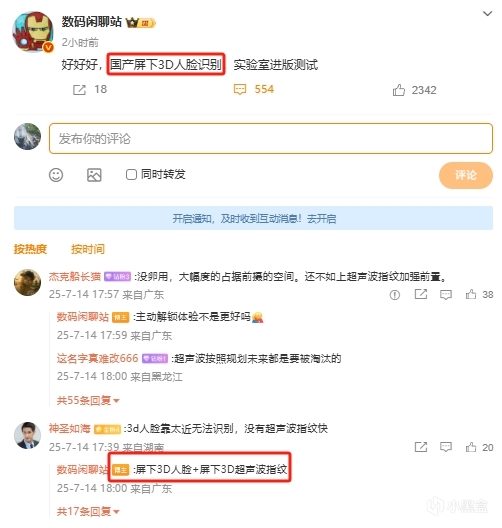 不管是機械升降結構,還是劉海,都只是過渡,手機行業的最終目標是將 3D 識別結構等放到屏幕下方,而近期知名數碼博主@數碼閒聊站 的博文爆料了最新動態,已經有企業開始實驗室進版測試了。