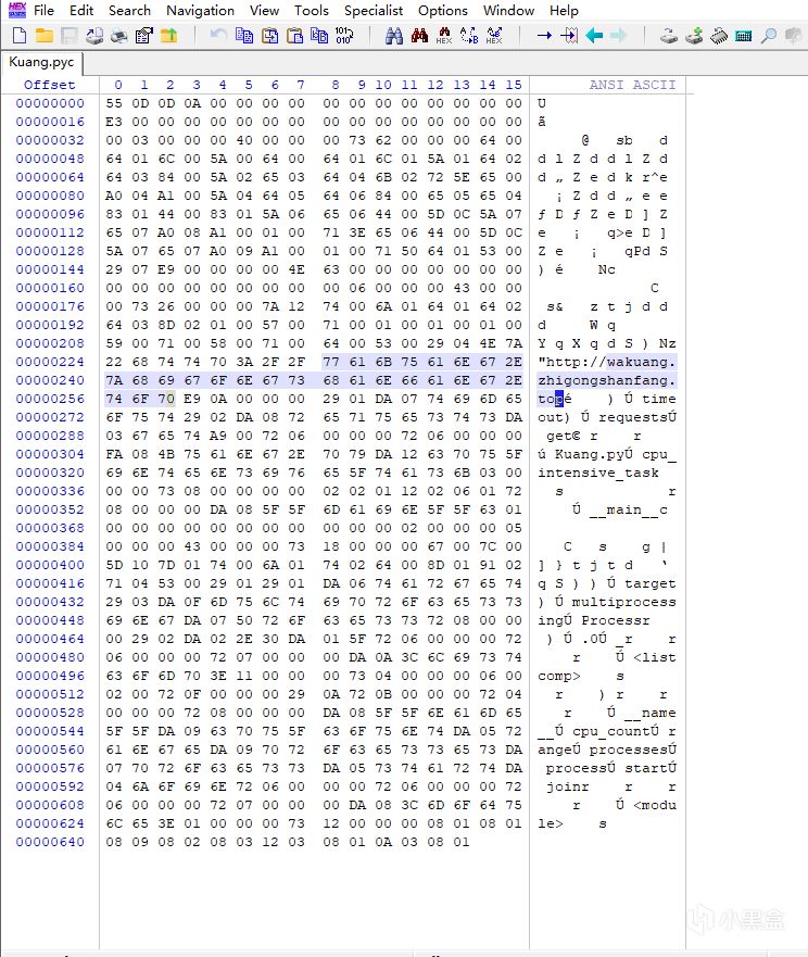 提取後,會得到一個Kuang.pyc,用winhex打開,旁邊的ASCII碼就顯示了它的域名