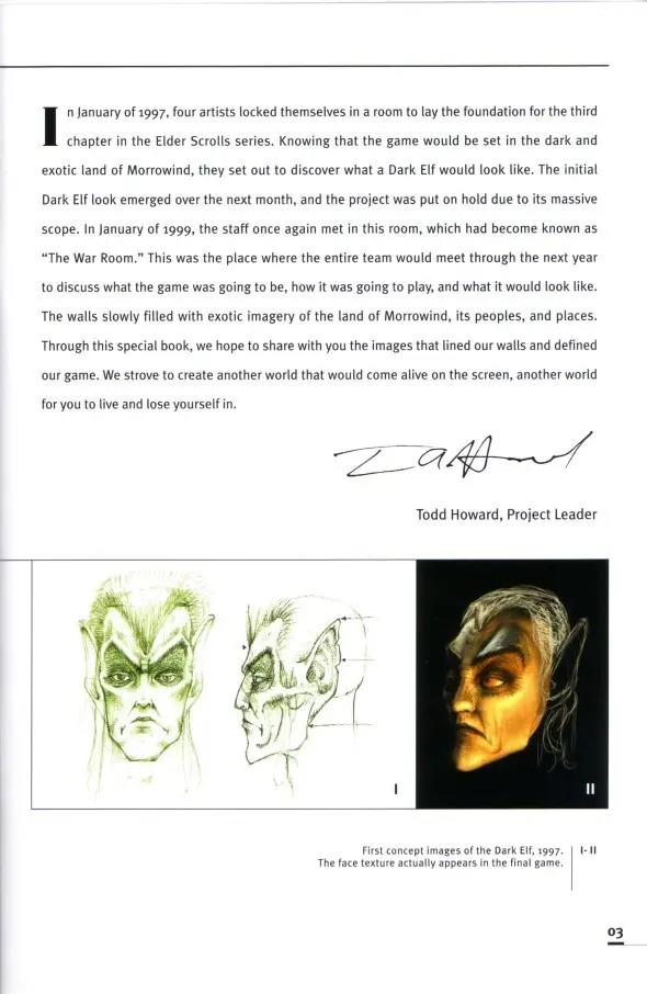 1997年1月,四位藝術家把自己鎖在了一個房間裏,爲《上古卷軸》系列的第三部遊戲奠定基礎。他們知道遊戲將設定在黑暗而奇異的晨風省上,於是着手探索黑暗精靈的外貌。接下來的一個月裏,最初的黑暗精靈形象浮現出來,但由於其龐大的規模,該項目被暫時擱置。1999年1月,工作人員再次聚集到這間被戲稱爲“戰爭室”的房間裏。在這裏,整個團隊將在接下來的一年時間裏,討論遊戲將是什麼樣子,它將如何運作,以及它將呈現什麼樣貌。牆壁上逐漸填滿了有關晨風省以及其中居民和地點的圖像。通過這本特別的書,我們希望與您分享那些曾裝點我們的牆壁、並定義了我們遊戲的圖像。我們努力創造一個能在屏幕上鮮活呈現的全新世界,一個您可以徜徉其中、忘卻自我的世界。