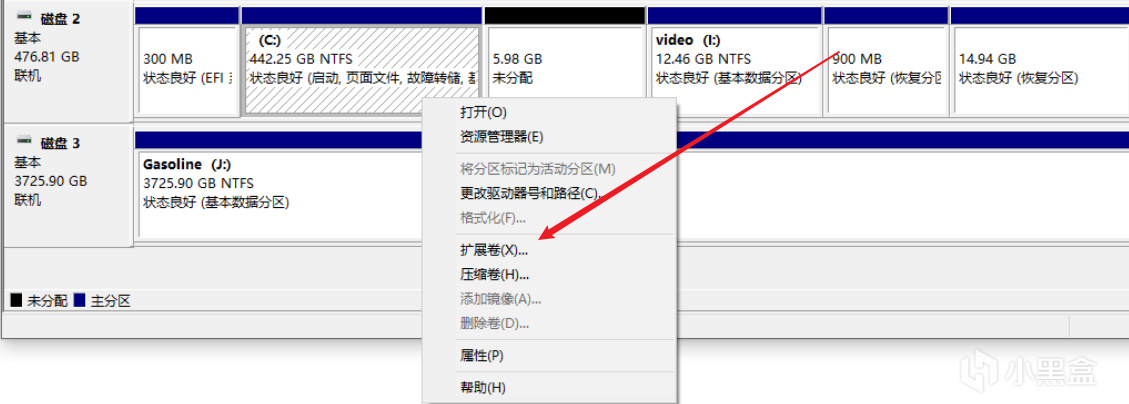 此时即可在C盘选择扩展卷,合并这个分区的空间: