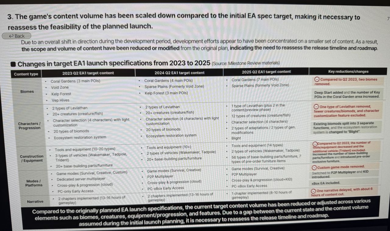 第一張爲2025年5月的評估表,應該是原定計劃今年下半年發佈的最後一次評估,As-is爲五月份前所開發的內容:爲一個初始地,一個完整的生態羣系,12種生物和兩種利維坦,20種工具和裝備,2套適應性系統,2種載具,單人聯機以及遊戲主線第一章的內容。這些大部分內容你能在最新一期實機預告裏面看到:包括外網此前線下測試爆料本作開局會在深海里,一個完整的生態羣系(實機中所有的淺水區場景),以及實裝兩種利維坦(完整出現過的克蘇魯利維坦以及最後一秒閃過被稱爲“收集者”的利維坦)