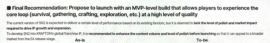 那爲什麼開發團隊會和發行商Krafton在發佈時間表上會有分歧,你不難從5月評估表的最終建議中找到答案:建議發佈一個MVP(最小可行性)版本,使玩家能體驗到高質量的核心玩法循環,這裏指一個核心玩法較爲完整的版本。而當前所開發的版本來說,能憑藉現有的粉絲基礎能獲得一定的市場表現,但大量內容的缺失,可能無法推動市場的擴展,一個品質較高的EA的版本能吸引更多的玩家。