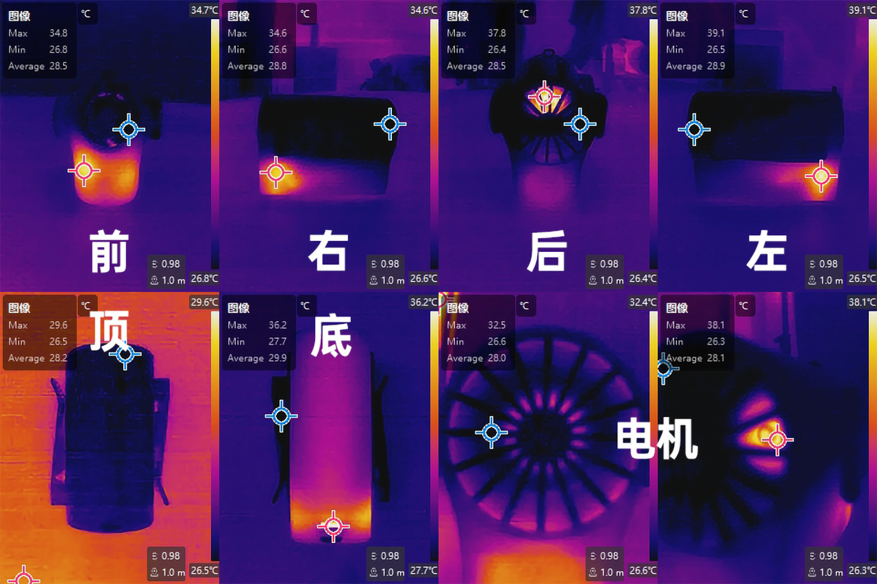 ▼最高档位满速连续吹10分钟,可以看到除了风扇下方和电机微微发热,其他地方温度低于环境温度,哪怕热成像显示发热的地方,手摸上去也是没啥温度感觉的,看来它温度控制设计不错