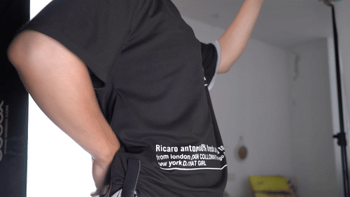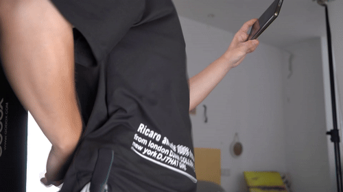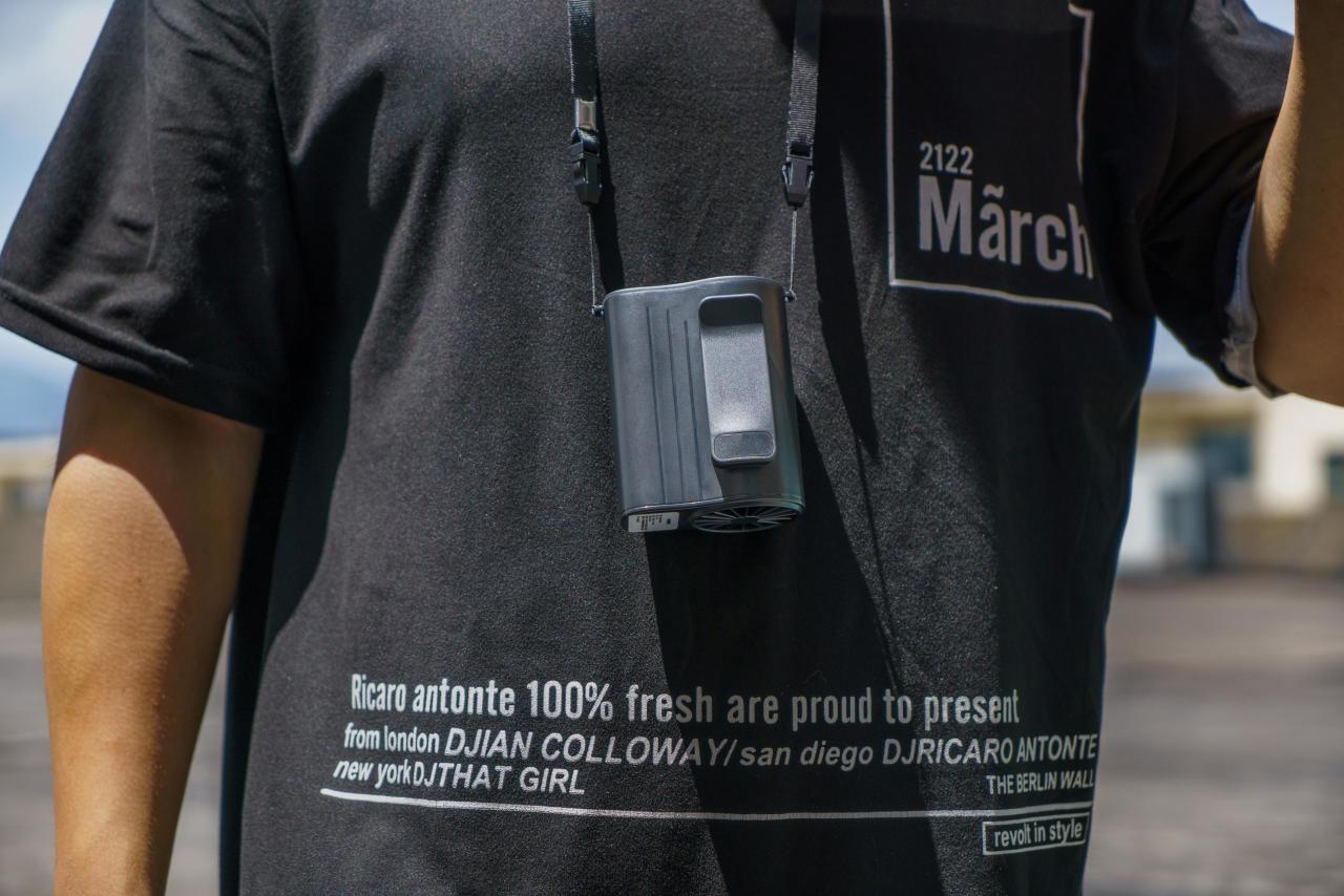 ▼可以通过衣服吹动的幅度看得出来,风力蛮大,有一个高速风扇可以直吹身体,降温效果还是比较明显的,当然你如果不想吹衣服里面,你就不用把衣边卡上去,它的风力也足够覆盖到头部