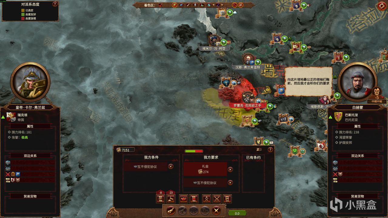 而在打下城池後我們部隊體力也已經耗盡,我們可以開始內政或是外交了,由於內政要花錢,我們先外交薅一筆。