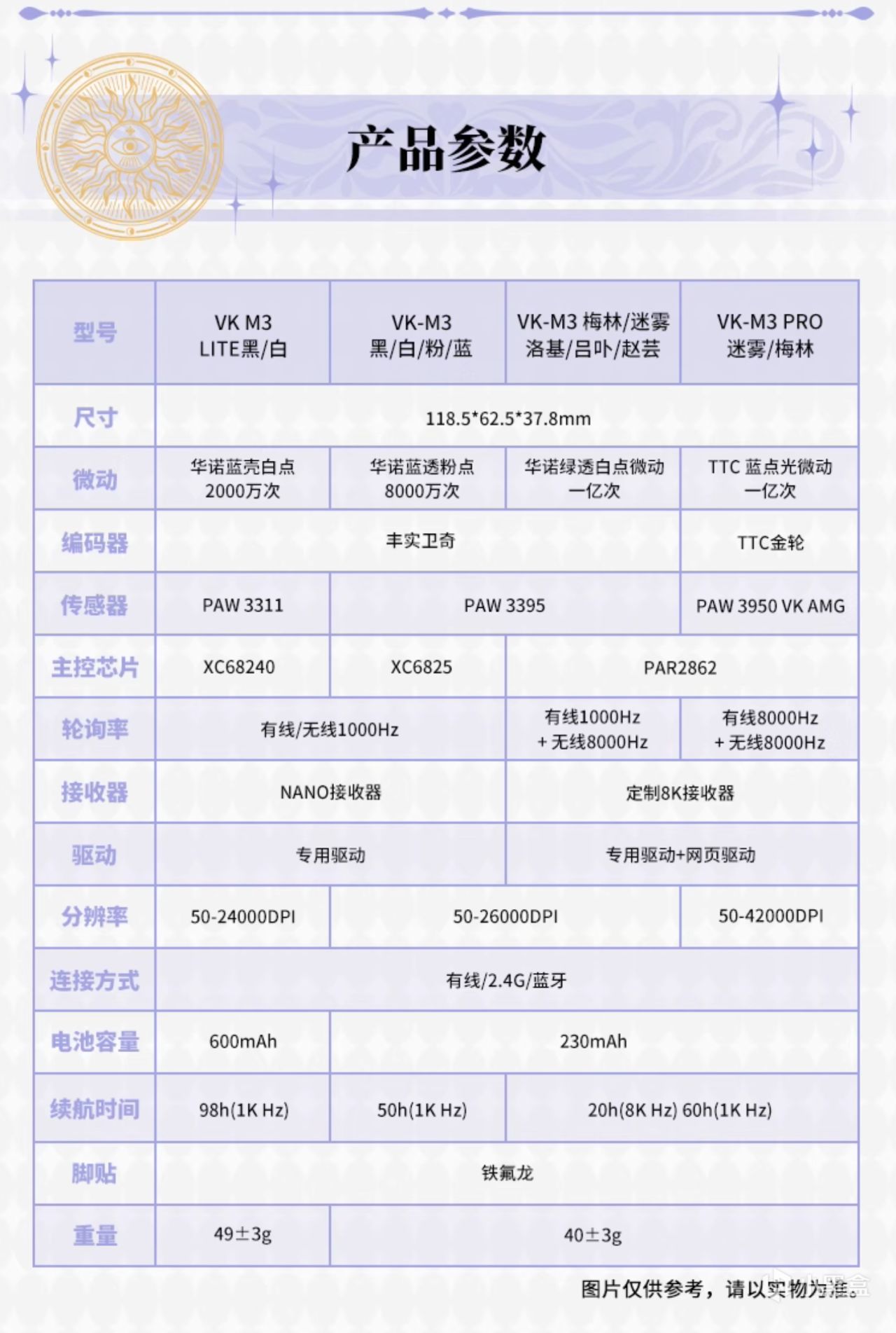 重量也是VK M3系列的一大亮點,低配49g,中高配和頂配全是40g左右,更別說和別的鼠標幾乎一樣的價格。不過這麼輕也有相應的代價,低配600mah,其它全是230mah電池,不過看VK標稱的續航時間來看,M3的能耗比非常優秀,在1Khz回報率下也能有較長的續航表現。