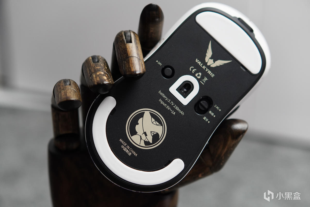 底部也同樣進行了一點設計,可以看到在大部分鼠標設計的接收器收納倉處,VK選擇放置了一個IP LOGO,其他則就是和正常鼠標差別不大了,三段式腳貼以及中間的DPI切換、傳感器以及三模切換開關。