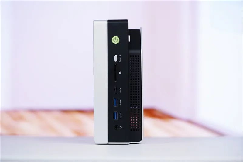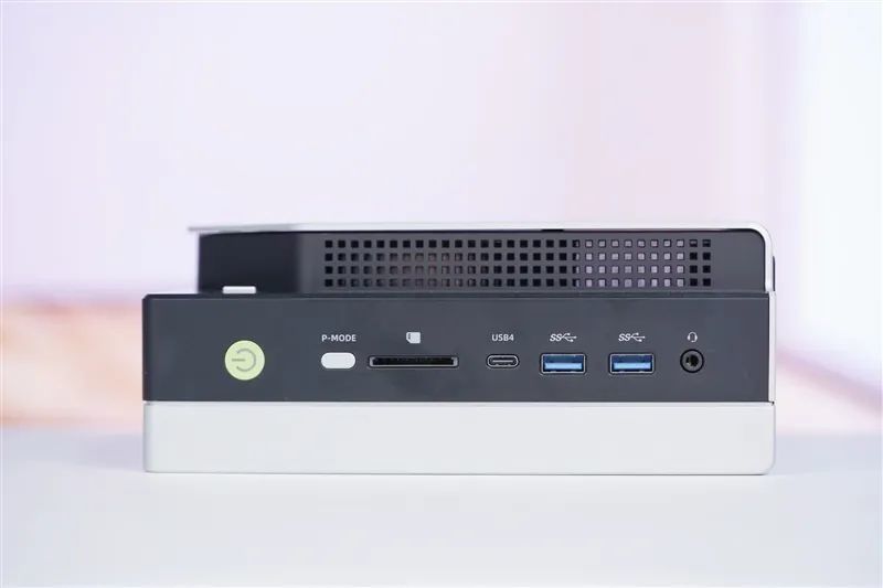 前置接口、从左到右依次是:电源按钮、性能切换按钮、SD卡槽、USB 4.0接口、2x10Gbps USB-A接口、3.5mm耳麦合一接口。