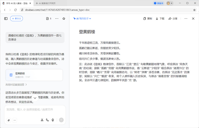 这是同样的命题,让豆包写的一首《登黄鹤楼》,比起235B的Deepseek,高下立判。