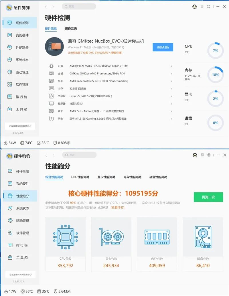 极摩客EVO-X2总分是1095195,超越了99%的用户。其中锐龙 AI Max + 395的CPU分数为353792,Radeon 8060S核显的图形分数是245935,内存分数409059,硬盘分数86410。