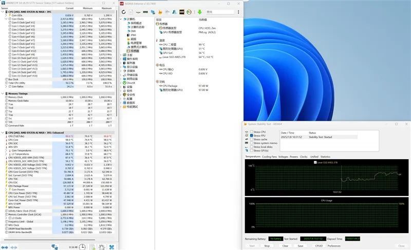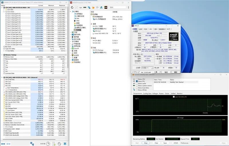 在CPU性能方面,Zen5处理器原本就拥有非常优秀的能效比,锐龙AI Max + 395的CPU核心在烤机7分钟的情况下可以稳定106W的性能释放。