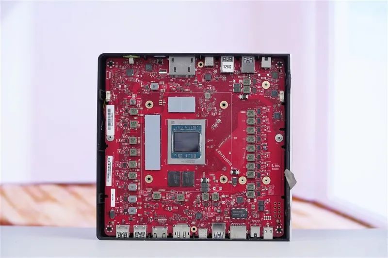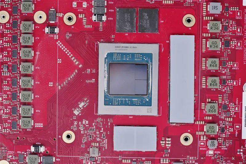 中间是锐龙AI MAX+ 395处理器,旁边是8颗美光LPDDR5X内存,总容量128GB。