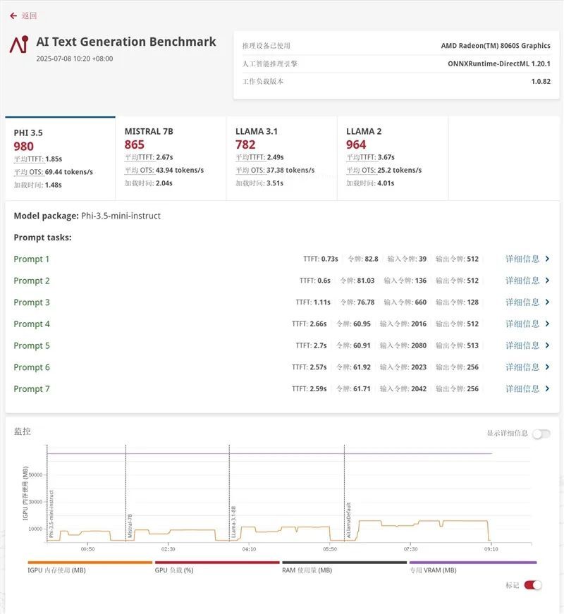 AI Text Generation Benchmark的测试,Radeon 8060S在LLAMA 2 13B的测试中,分数是RTX 5050的三倍。