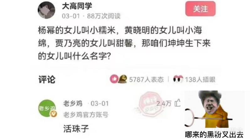 一战成名之梗!2023年3月,有网友在社区平台发问,杨幂、黄晓明等明星的孩子都有昵称,那蔡徐坤的孩子叫什么名字,老乡鸡官方账号回复“活珠子”。