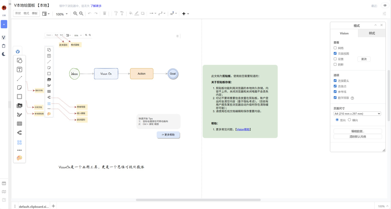 VisionOn 定位为“新一代轻量在线图形工具”,它不仅仅是一个简单的画板,更是一个辅助用户进行深度思考和信息组织的可视化白板。
