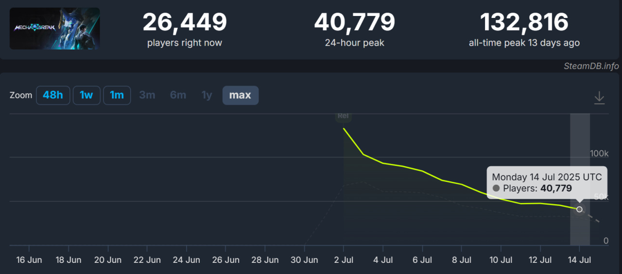 游戏发售后(免费游戏或许该叫上线),在热度上取得了世俗意义上的成功:Steam首发在线破13W(自家官网还有很大一块份额),然后便是持续走低,来到了4W区间。