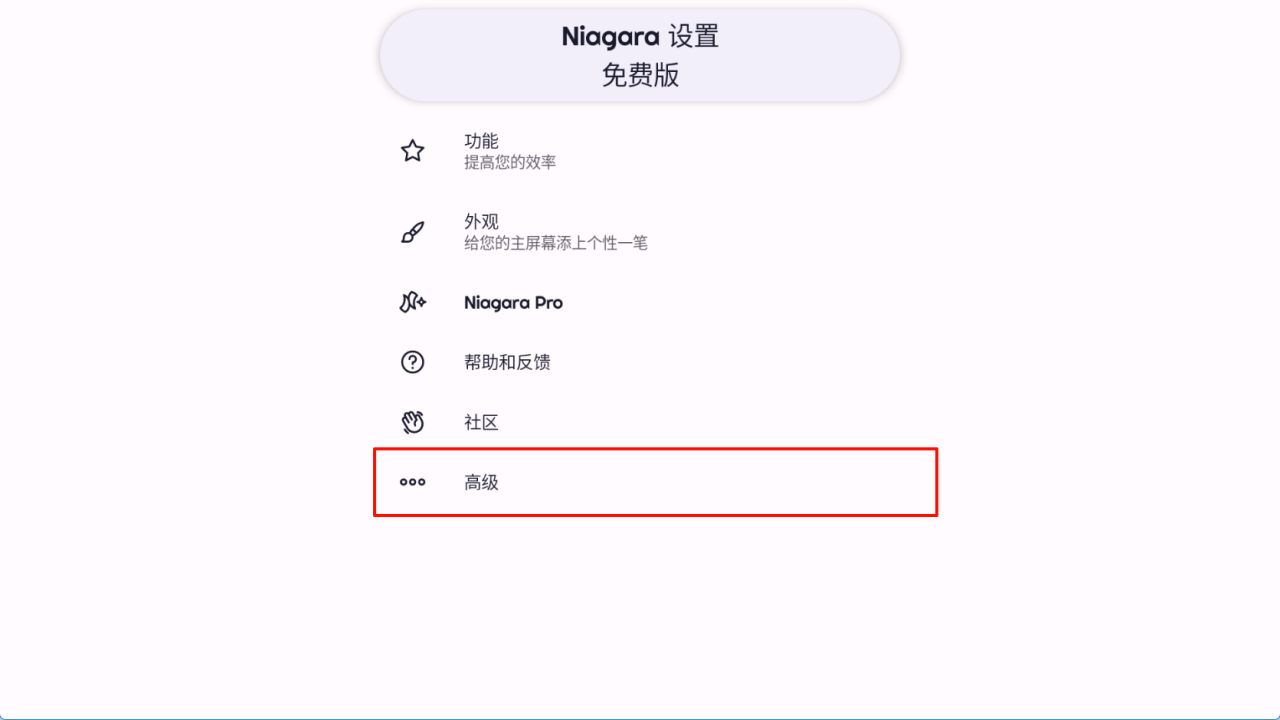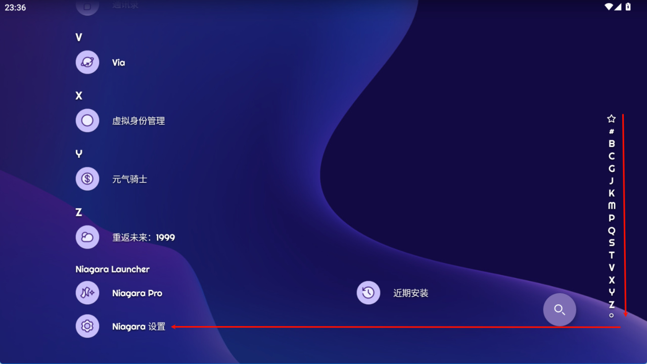进入桌面后,鼠标在右侧字母区向下滑动,打开Niagara设置(如图)
