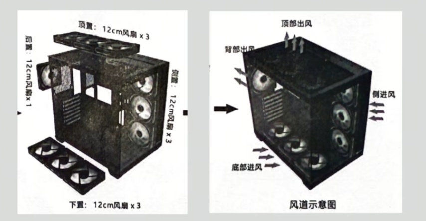 接下来就可以给机箱上装风扇了,可以参考以下风道
