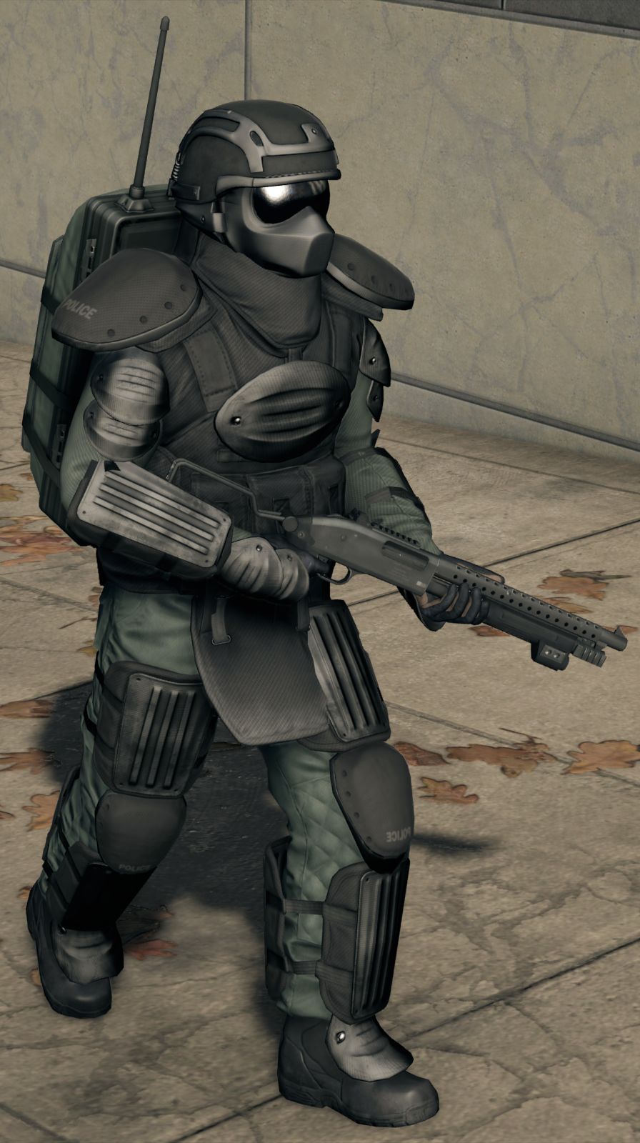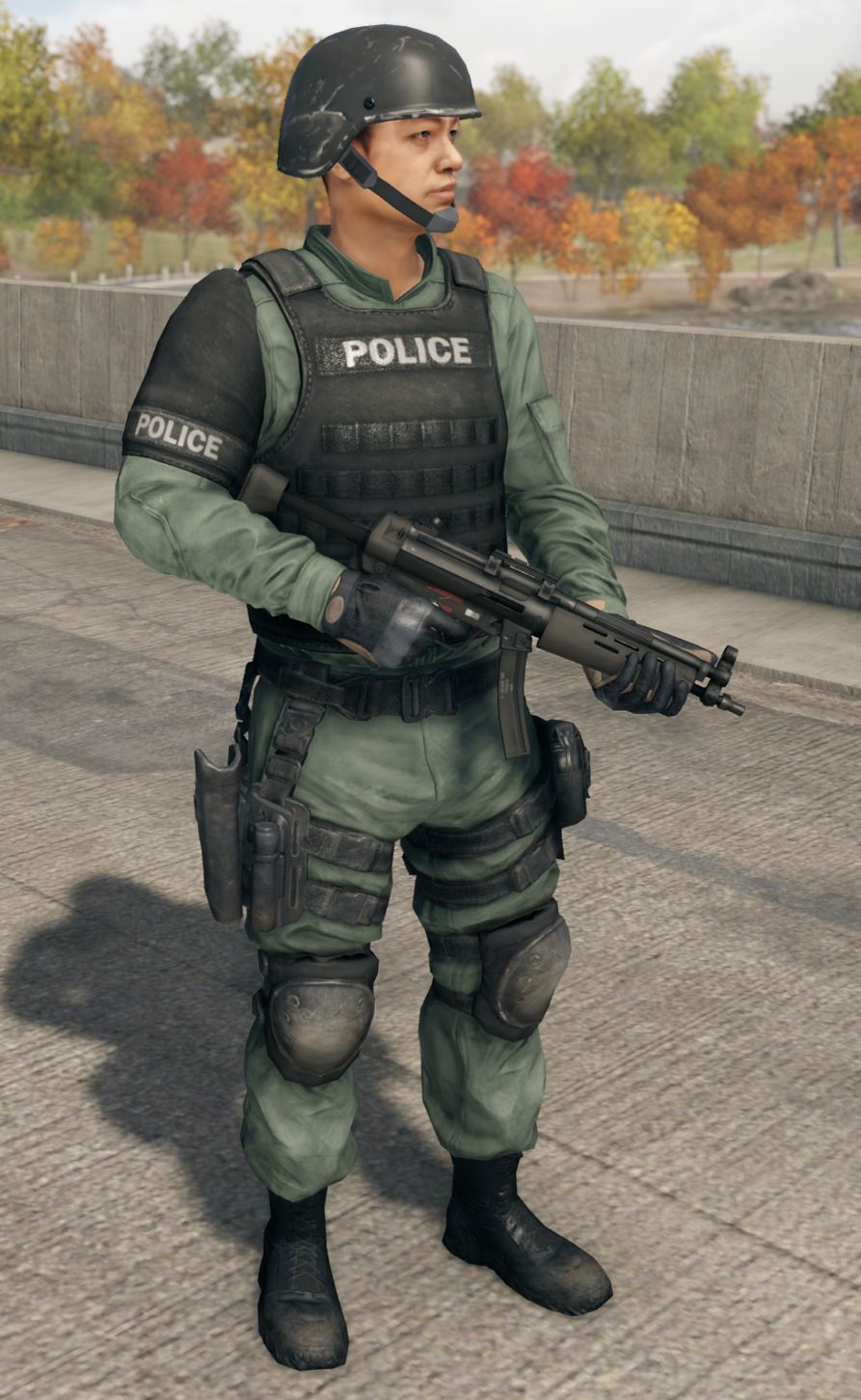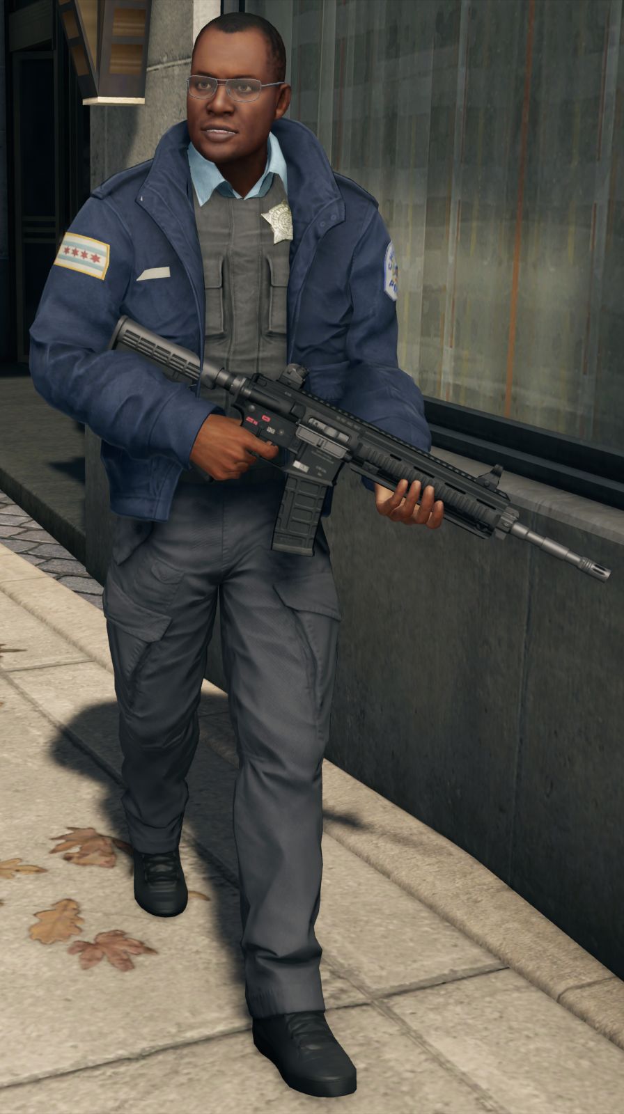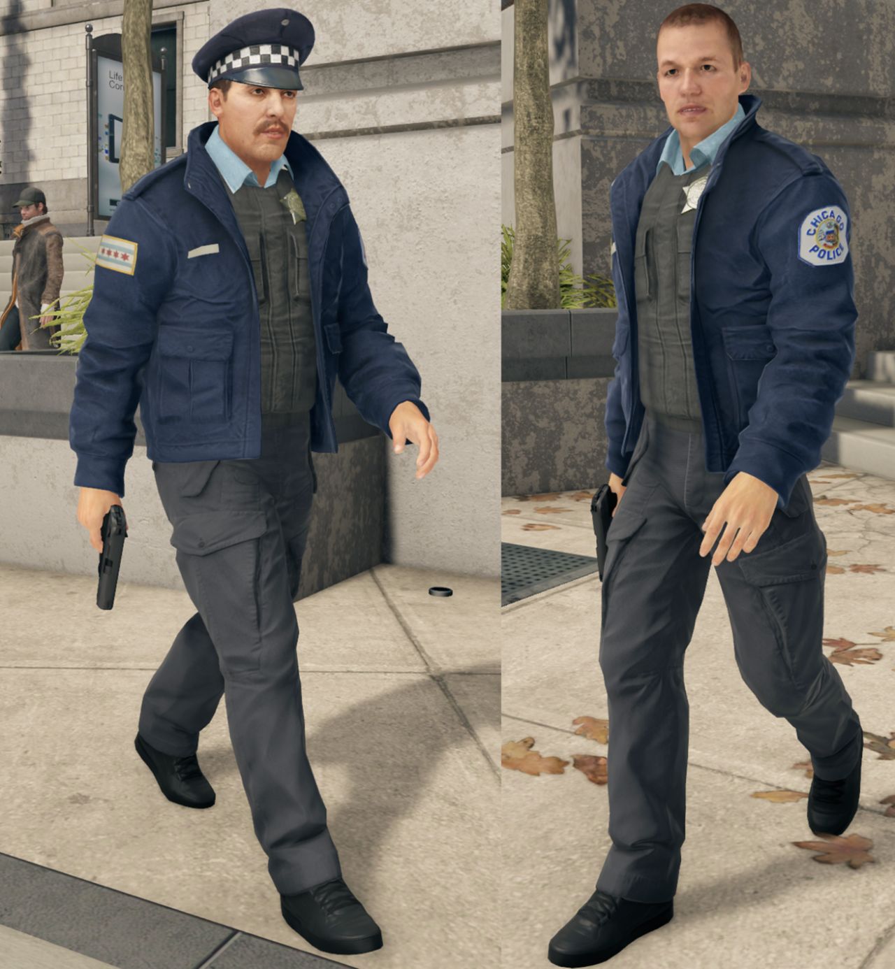 这些警员的穿着都是统一的深蓝色外套,以及无论现场情况如何都佩戴了一件防弹衣,防弹衣上还挂着警徽,有些警员会选择带着大檐帽出门。这些警察是为数不多在街头还能看到的一类,一旦看到你了就会像影子一样紧追着你不放,处于最低通缉等级,他们还不会使用相对太大威力的武器,仅仅是一把Px4半自动手枪。