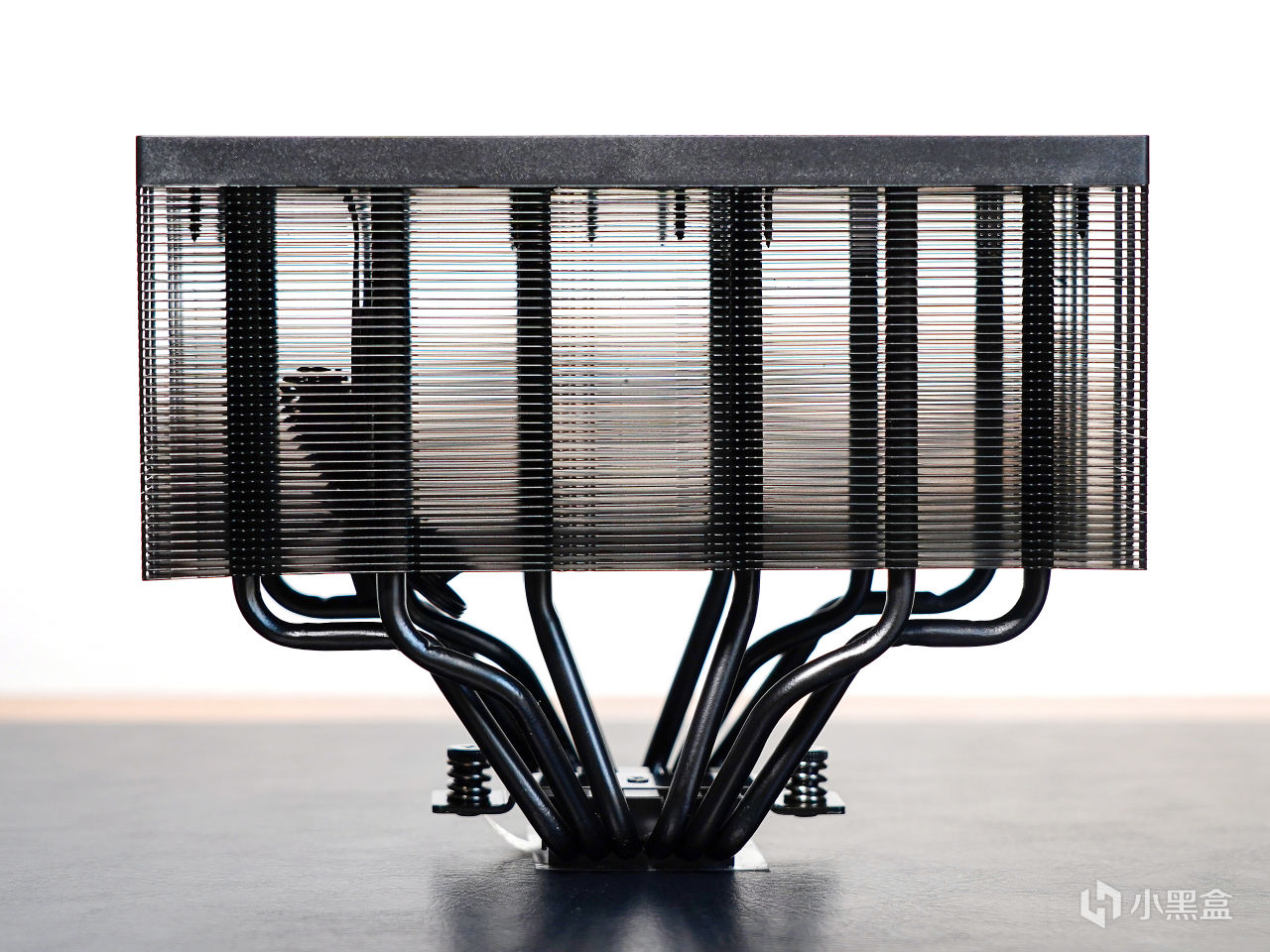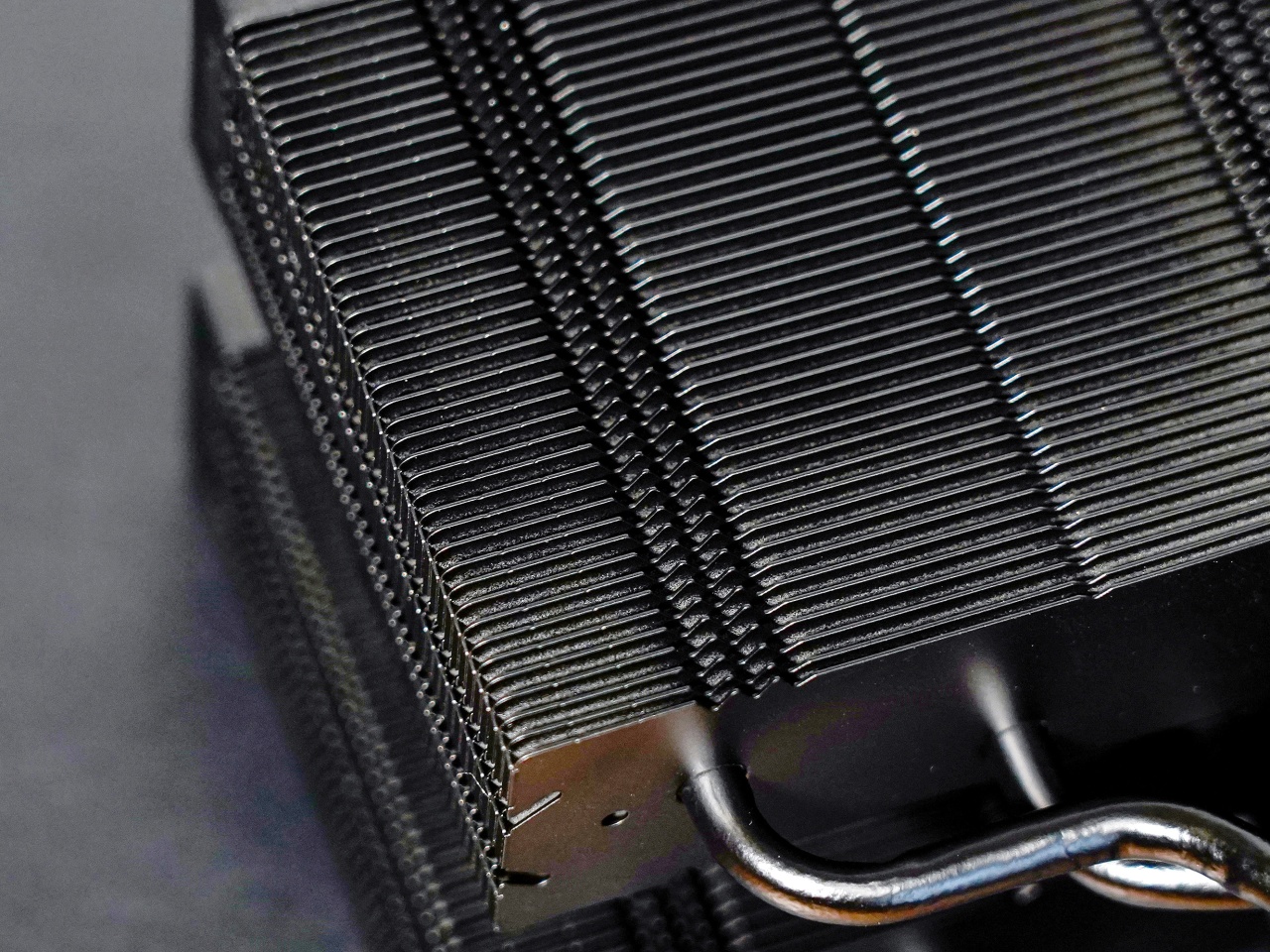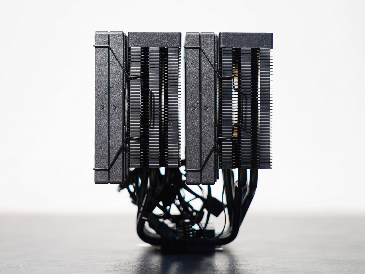 ▼從側面看就是標準的雙塔結構,每個塔體有42組鰭片,採用了穿 Fin + 折 Fin 組合工藝,聚攏氣流。