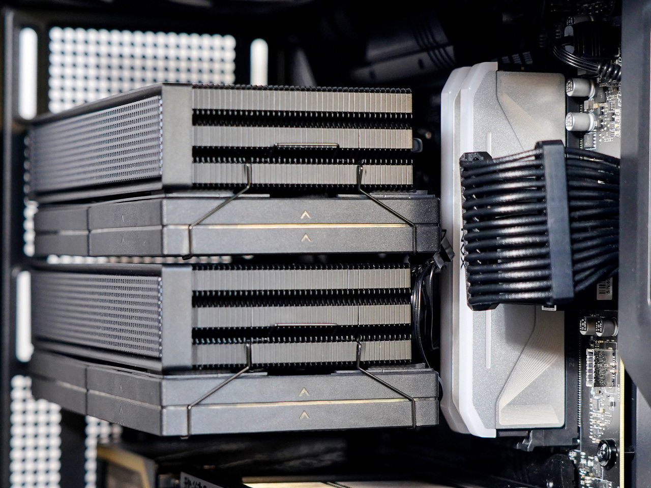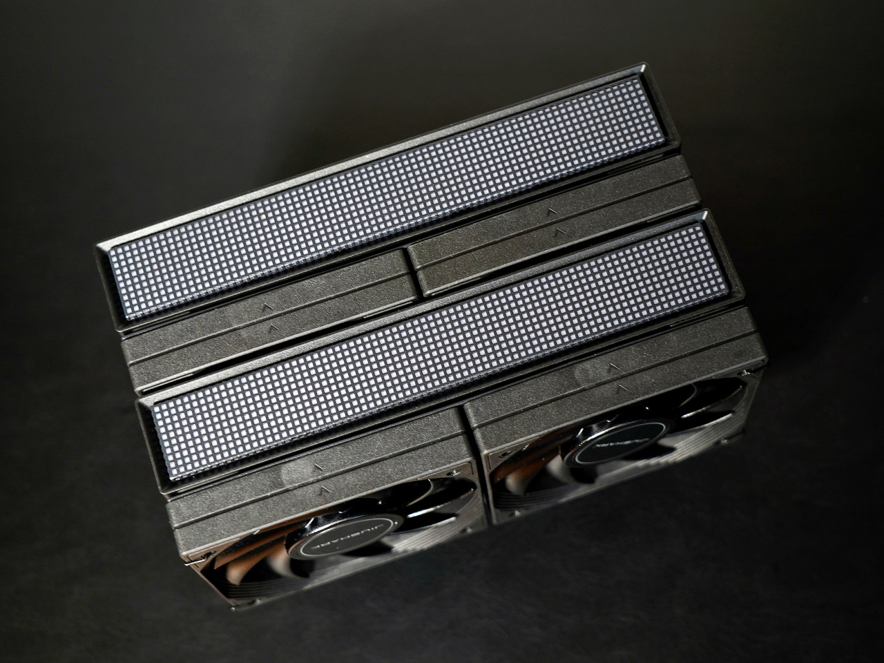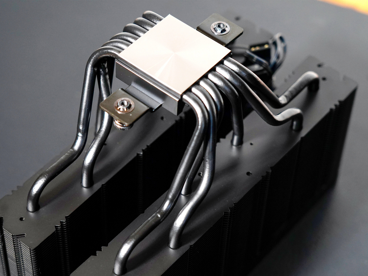 ▼從側面看就是標準的雙塔結構,每個塔體有42組鰭片,採用了穿 Fin + 折 Fin 組合工藝,聚攏氣流。