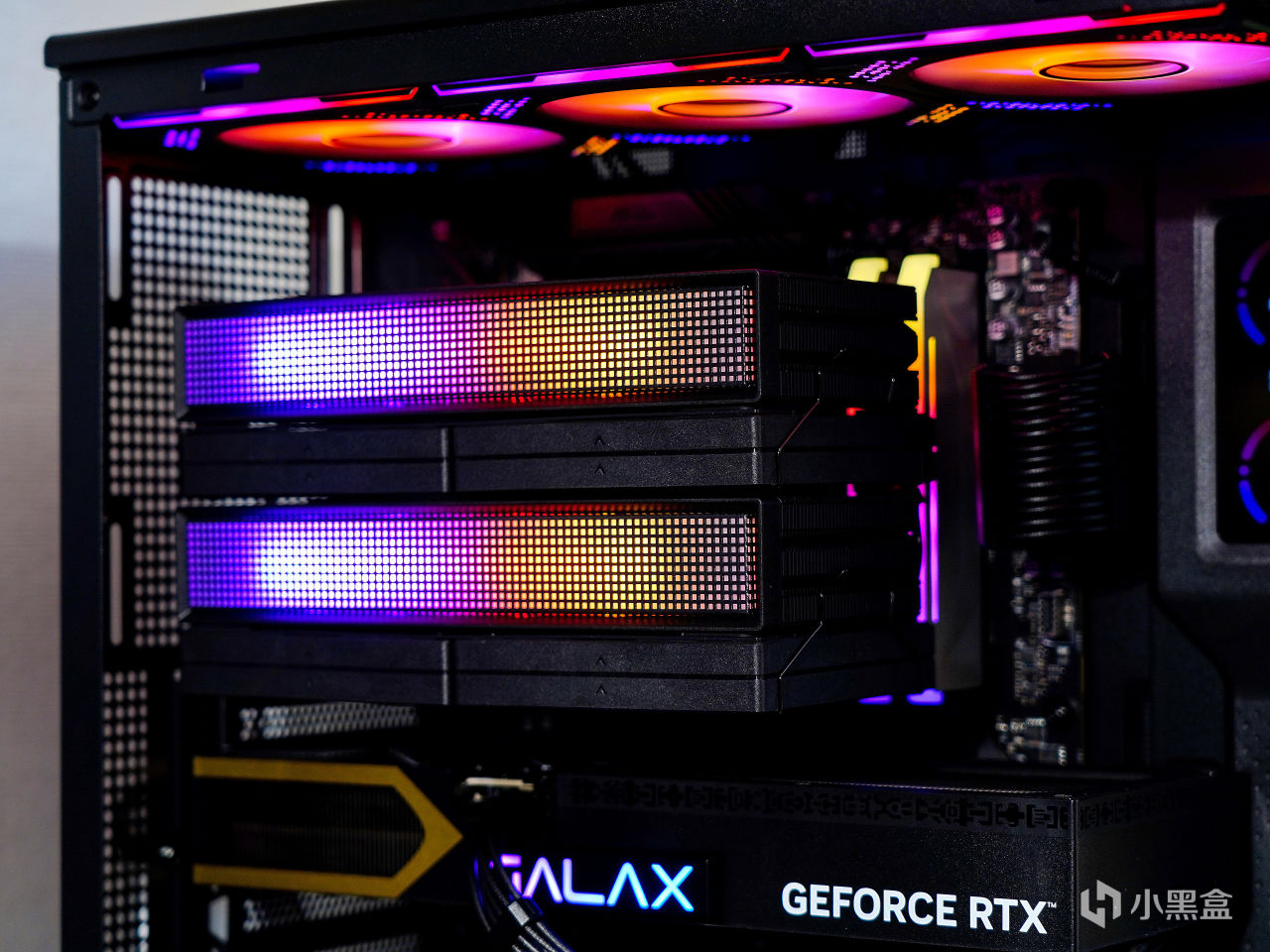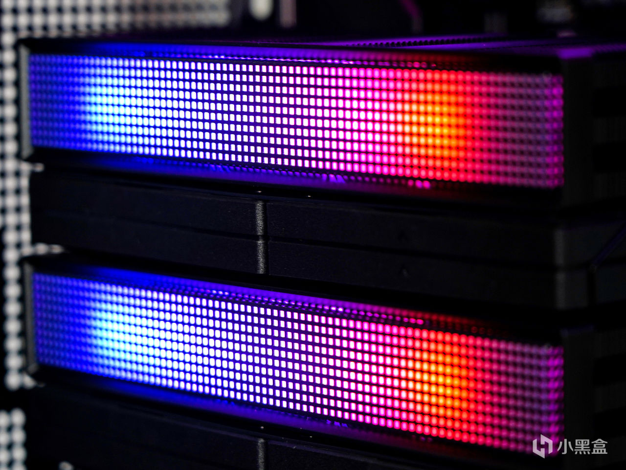 ▼散熱器頂部也是九鯊特有的風格,頂蓋爲mesh鐵網設計,下面則是ARGB的發光面板。可以看到頂蓋的面積特別大,光效帶了衝擊力也非常大!