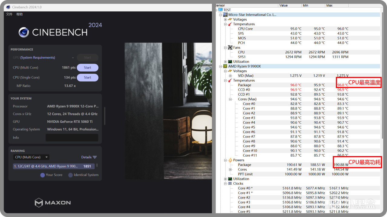 ▼PBO Advanced,頻率提升到最高,不設置溫度牆。還是CineBench R24測試,CPU最高溫度96°C,功耗達到了190w,也是觸碰到了溫度牆,不過後期CPU頻率還是能維持在5.1~5.2GHz,多核得分達到1861,性能提高了5%。