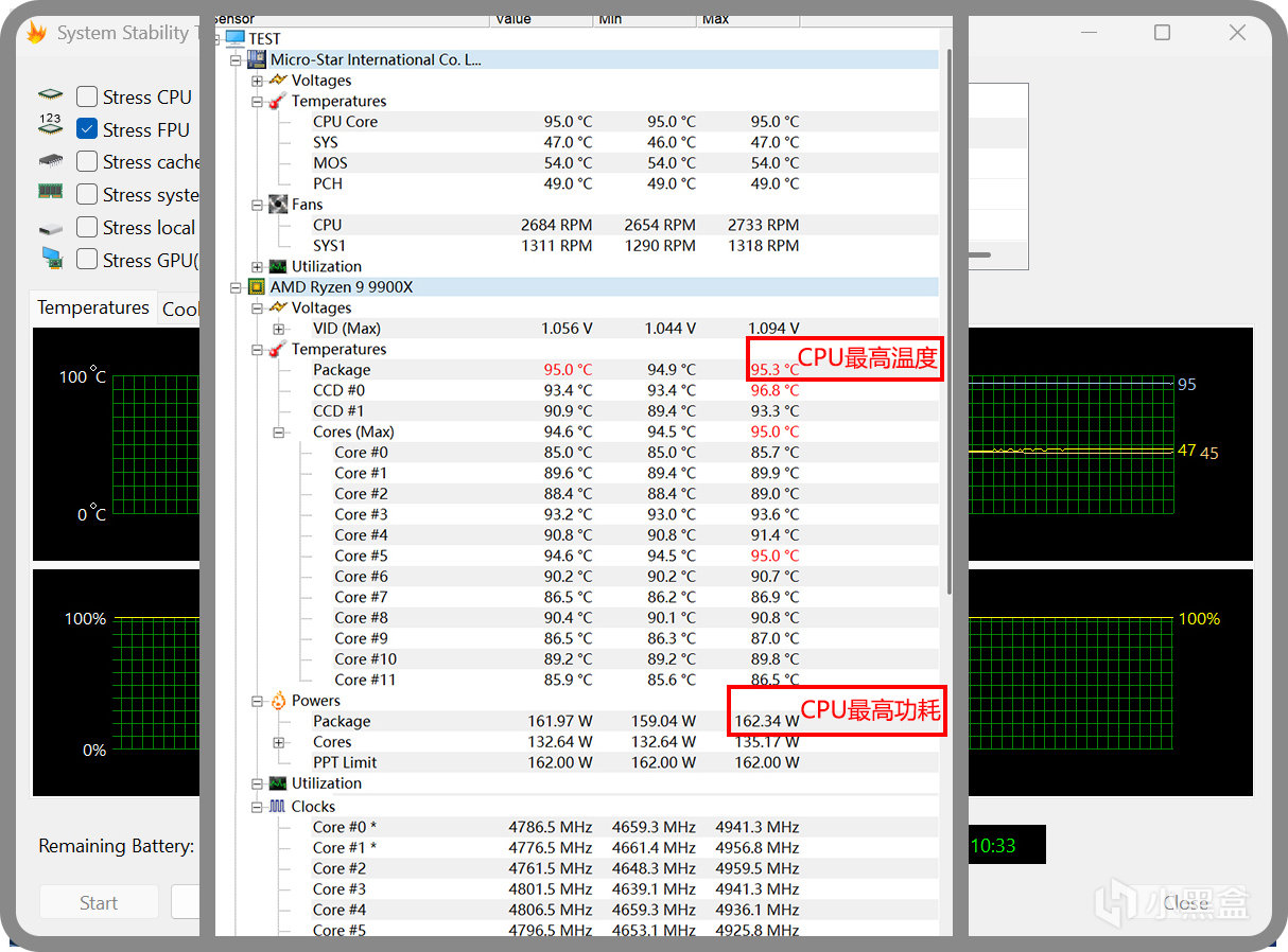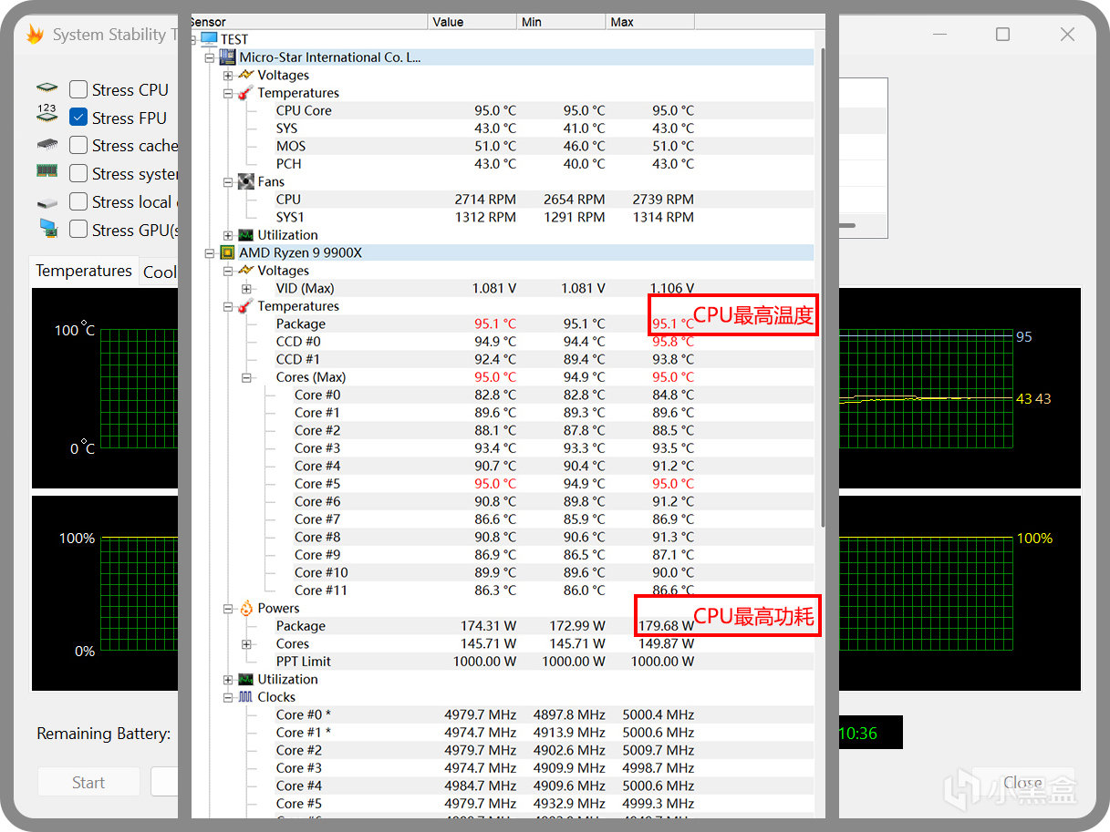 ▼ADIA64 FPU烤機,CPU毫無意外,達到默認的95°C溫度牆,不過PBO後頻率還是會高一些的。9900X這款CPU如果使用風冷散熱器,還是建議使用把溫度牆設置成75~85°C,性能很可能還要比Auto好一些,並且溫度還低。