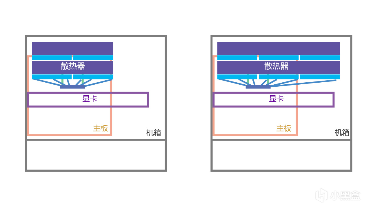 ▼在風道方面,JF15K 很適合前面板無進風口的海景房機箱,這樣就形成了很典型的垂直風道。不過要使用這款散熱器,對機箱和主板都是要求的。機箱要能達到JF15K 的高度要求;主板則需要選顯卡插槽在第二PCl擋板位的(ATX主板會多些),只有這才能讓散熱器和顯卡之間留出進氣空間。此外還要注意JF15K 的塔體是向一個方向偏移的,只有安裝方向正確(參考下圖),才能留出進氣空間。當然如果是核顯用戶就不能操心這些了。